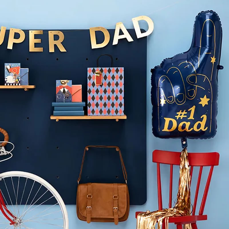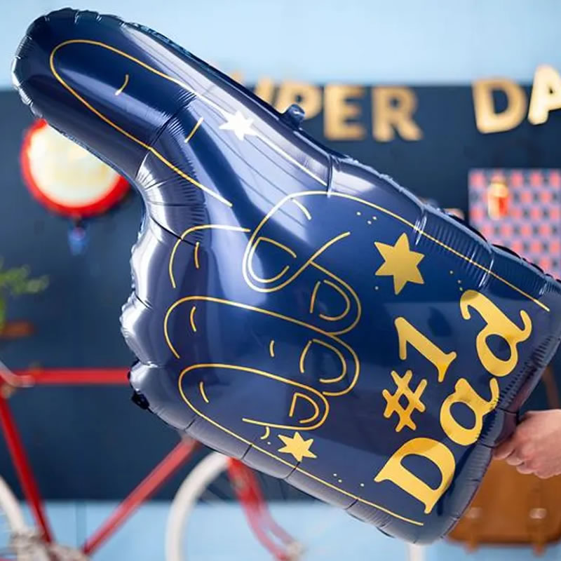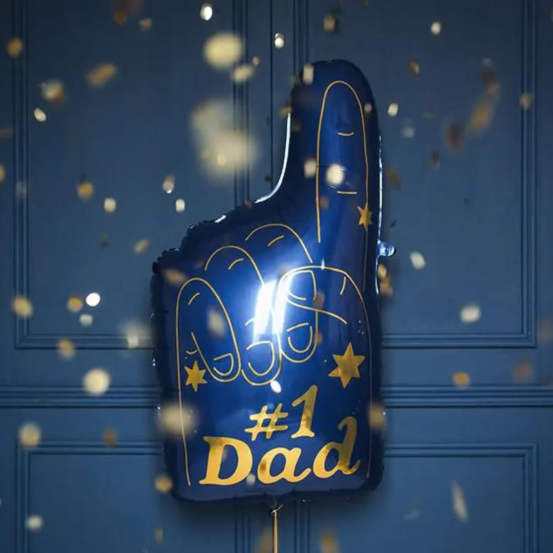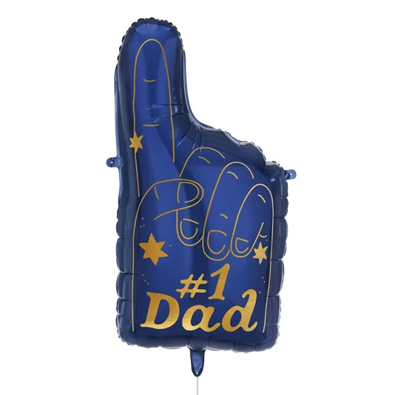 Navy blue foil balloon shaped like a foam finger boldly declares "#1 Dad" with gold accents. The perfect decoration for Father's Day or Birthday celebrations. Makes dad feel like the champion he is. Fill with air for hanging or helium for floating.