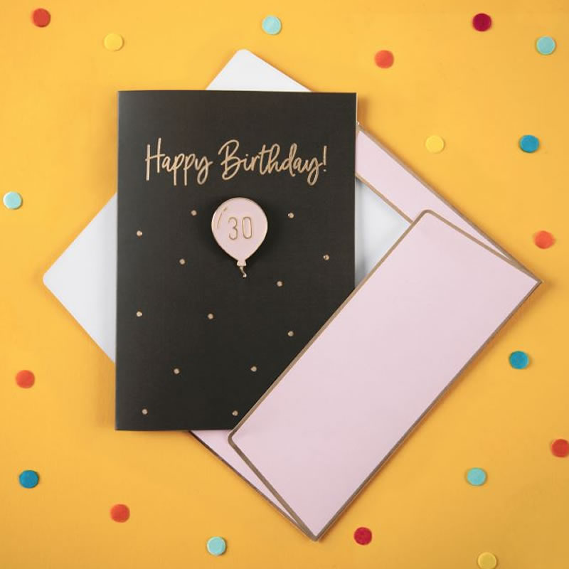 This 30th birthday card features a sleek, matte black finish and a detachable 30 balloon pin. Measuring 14.8cm x 10.5cm, the card has a blank interior and a gold dot design with a "Happy Birthday" message in gold lettering. The main focus is the balloon-shaped pin in a subtle, delicate pink color. It also comes with a stylish pink envelope adorned with metallic gold foil trim for an elegant touch.