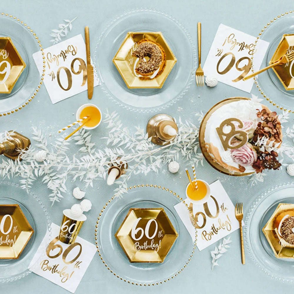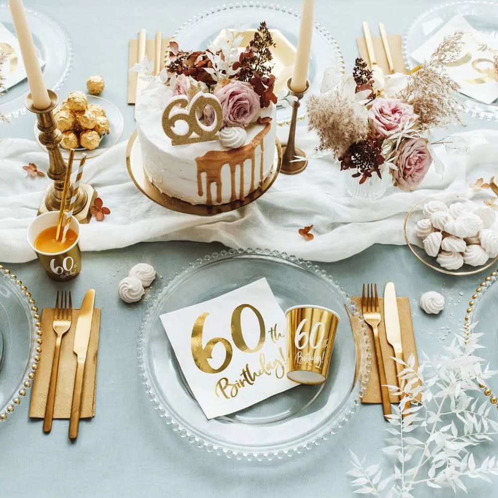 Elevate your loved one's 60th Birthday décor with these elegant paper napkins with gold foil '60th Birthday' inscription. The perfect decoration for your loved ones milestone birthday.