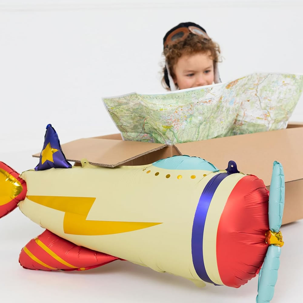 Daring yellow and red aeroplane foil balloon with gold stripes and purple wizard hat detail. This large 91cm long balloon makes it the ultimate party showstopper. Fill with helium to float or air for ground display. Guaranteed to make your celebration take flight!