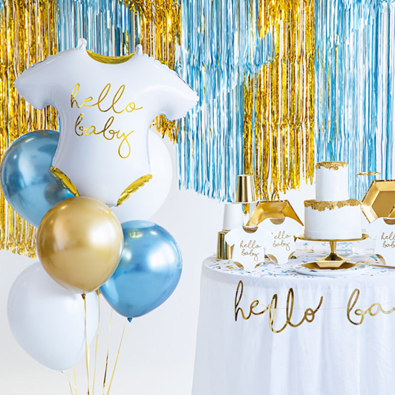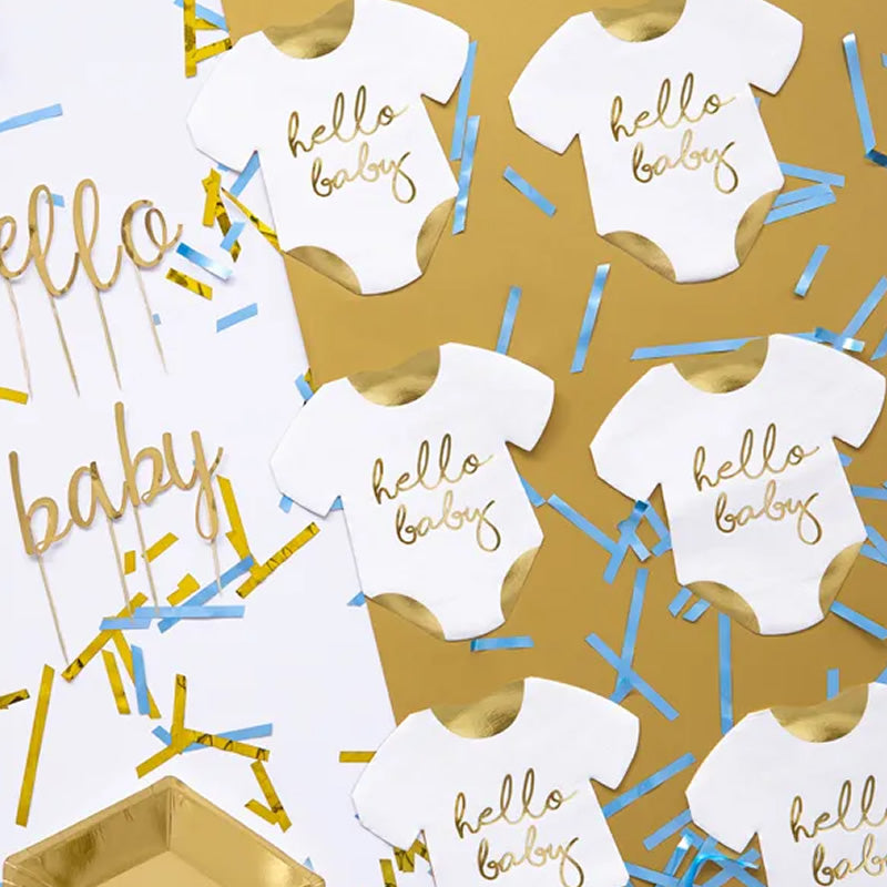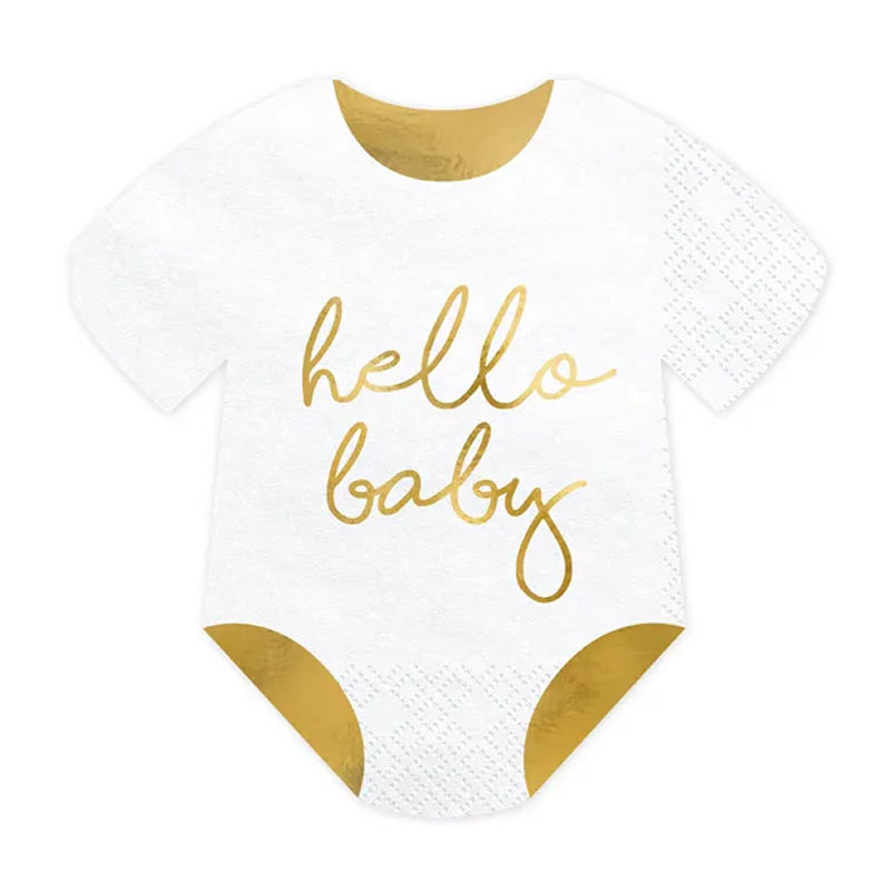 Celebrate the arrival of a new baby with these adorable 'Hello Baby' gold foiled napkins. Perfect for baby showers or gender reveal parties, featuring cute baby romper design.