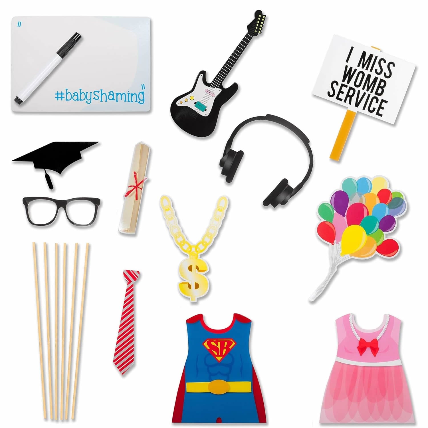 The Baby Selfies Photo Prop Kit includes 12 colorful props with bamboo sticks to help dress up and take cute photos of your little one. It's the perfect way to capture precious moments with your baby.