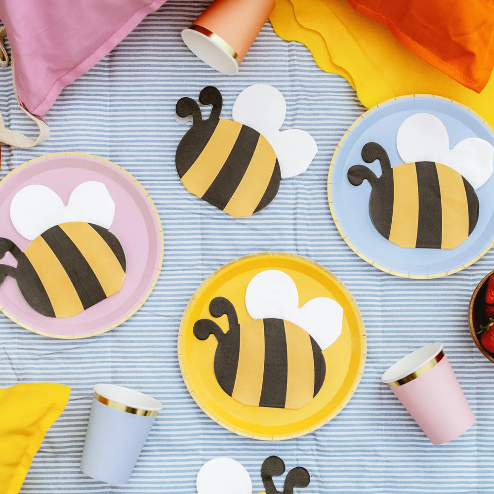 Add a playful buzz to your party with these bee-shaped paper napkins. Each pack has 12 napkins featuring a cute black and yellow bee on pastel backgrounds. Perfect for garden parties or any fun event, they’re easy to use and clean up, making your celebration both stylish and effortless.