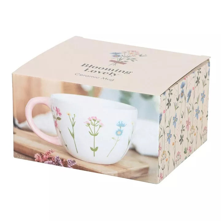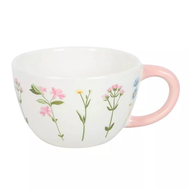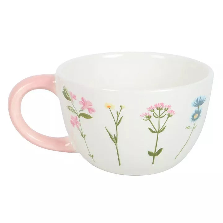 Taking inspiration from vibrant spring flowers, this charming ceramic mug showcases countryside chic. Its curved handle in a soft shade of pale pink, beautifully complements the floral pattern. This oversized mug is perfect for gifting for Mother's Day, teacher gifts, birthdays and more to brighten their day with every sip. 550ml capacity. Not suitable for microwave. Handwash only.