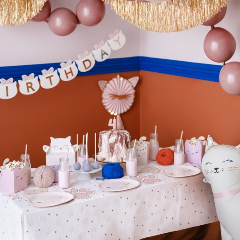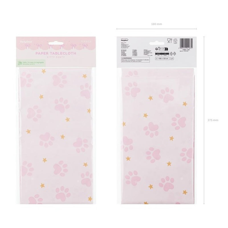 A cat paw-printed paper tablecloth measuring 180 x 120 cm (approximately 71 x 47 inches), perfect for parties or everyday use. Designed for single-use convenience, eliminating the need for laundering after events or gatherings. The whimsical cat paw print pattern adds a touch of playfulness and charm to any table setting.