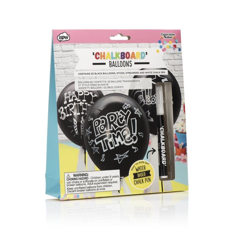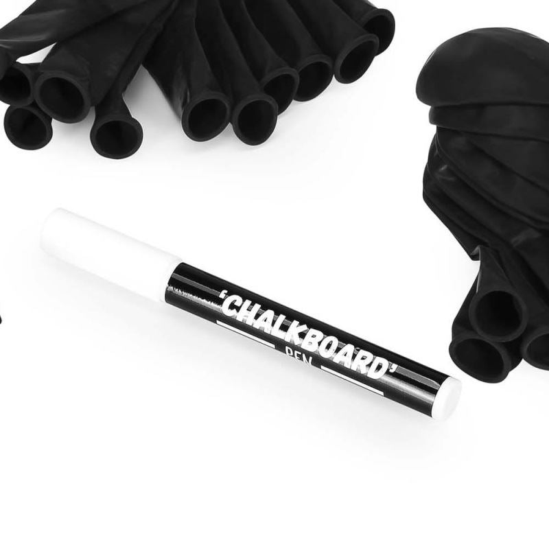 Make your party as unique as you are with this stylish balloon kit containing 20 black balloons and water based chalk pen. Create unique designs or write messages for your party guests. For the ultimate personalized party gift pop onto a balloon stick and tie on white crepe paper streamers for maximum impact.