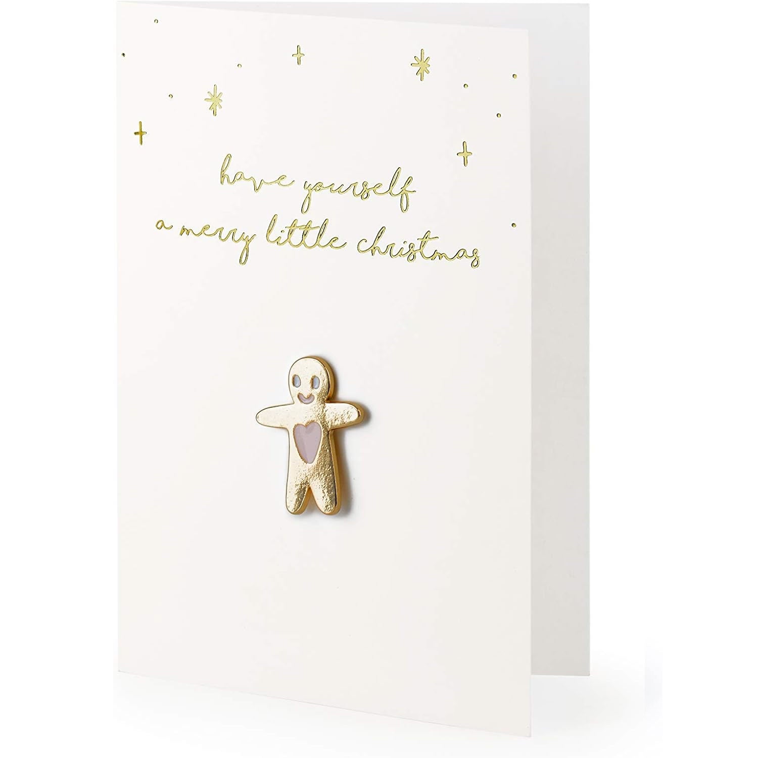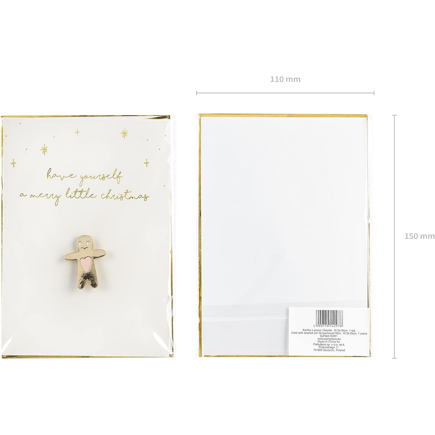 A beautiful white card with a stunning gold metallic print, accompanied by a charming enamel pin in the shape of a gingerbread man. Includes a white envelope with gold metallic print. The perfect keepsake gift to share with a beloved recipient, wishing them a joyful Merry Christmas.