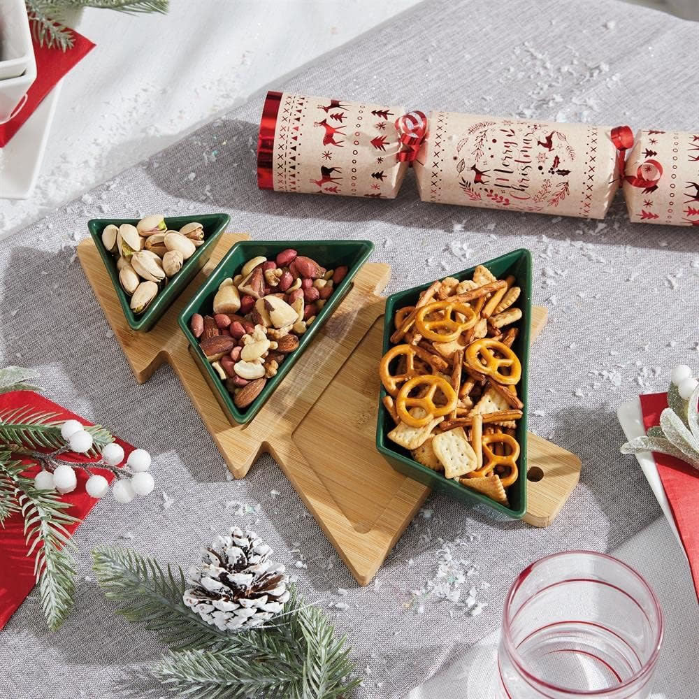 Add a touch of Christmas cheer to your table with this 3-piece ceramic bowl set and bamboo tray in a charming Christmas tree shape. Perfect for serving snacks, dips, and other appetisers at festive gatherings and parties. The ceramic bowls fit neatly within the insets of the bamboo tray to prevent sliding. Care Instructions: Hand wash only; not suitable for microwave or dishwasher use.