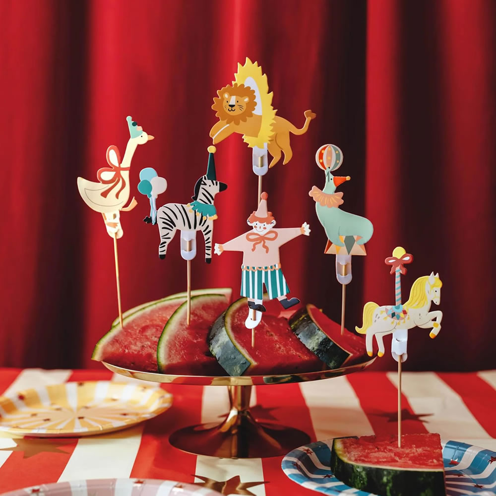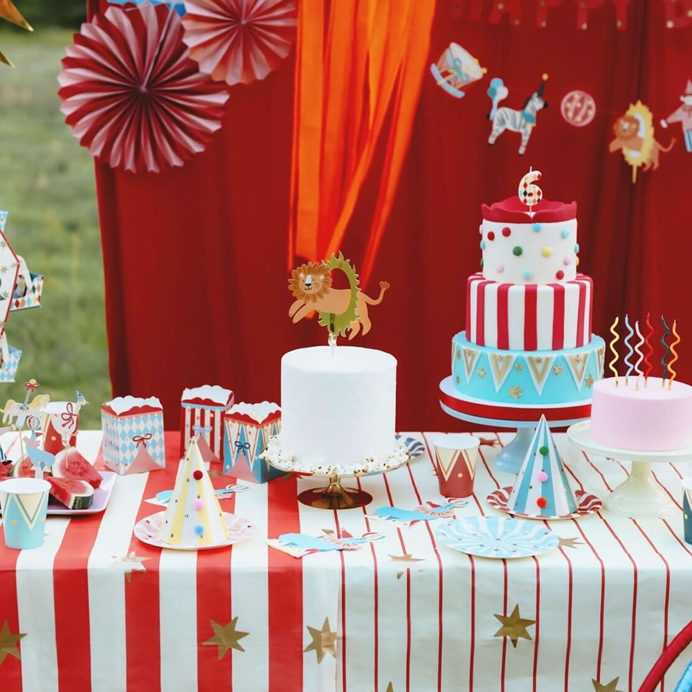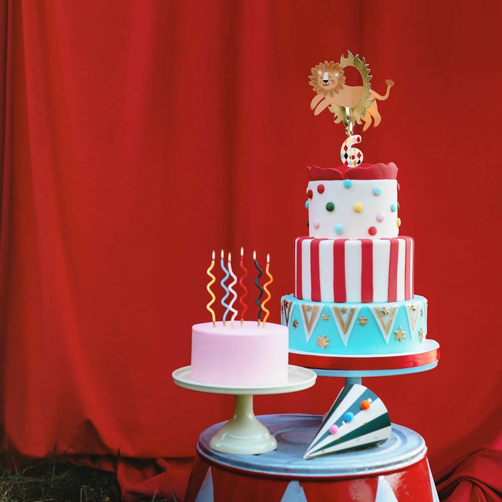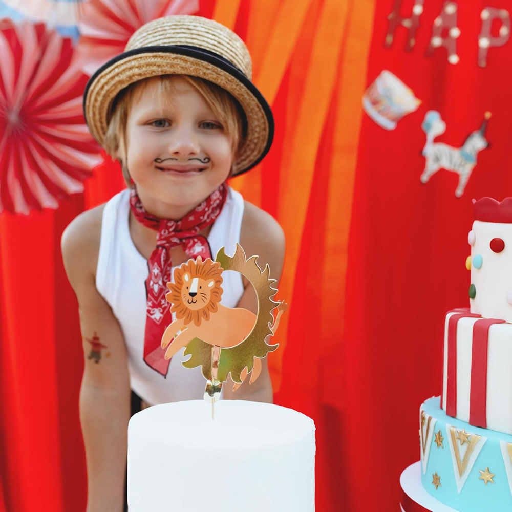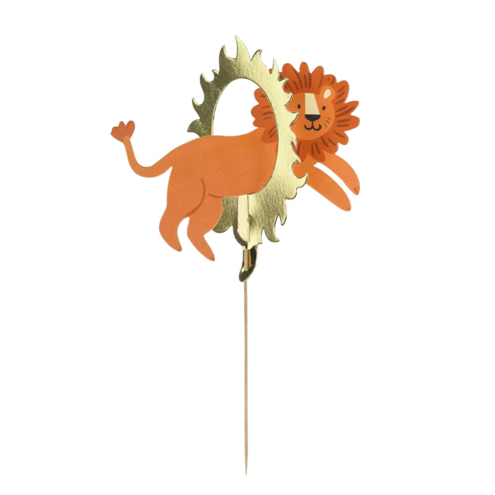 Bring bold fun to your circus party with this striking lion cake topper. Featuring a vibrant orange lion leaping through a shiny gold ring, it creates a daring centrepiece. Easy to assemble with two paper pieces and a wooden stick, it fits most cakes perfectly. Make your celebration unforgettable with this playful, eye-catching design. Measuring 16 x 16 cm.