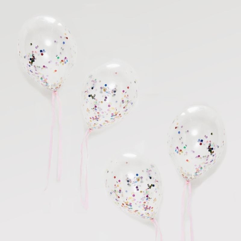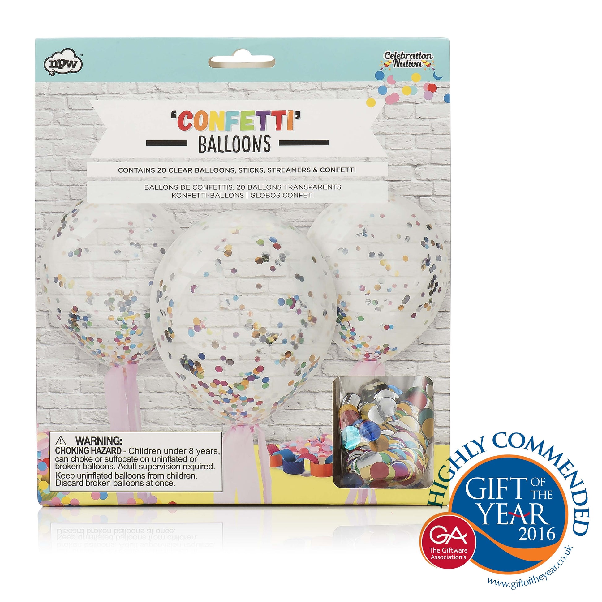 Pack of 20 transparent latex balloons with multicoloured, shiny confetti decoration. Includes balloon sticks and crepe paper streamers. Beautiful balloon decorations ideal for weddings, hen do's or baby showers. Made from natural latex.