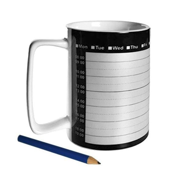Novelty Ceramic Mug with Weekly Calendar + Pencil. This unique mug will help you start the day in an orderly manner. You can organise your agenda while you have a hot cuppa.