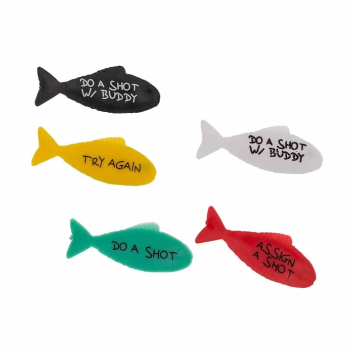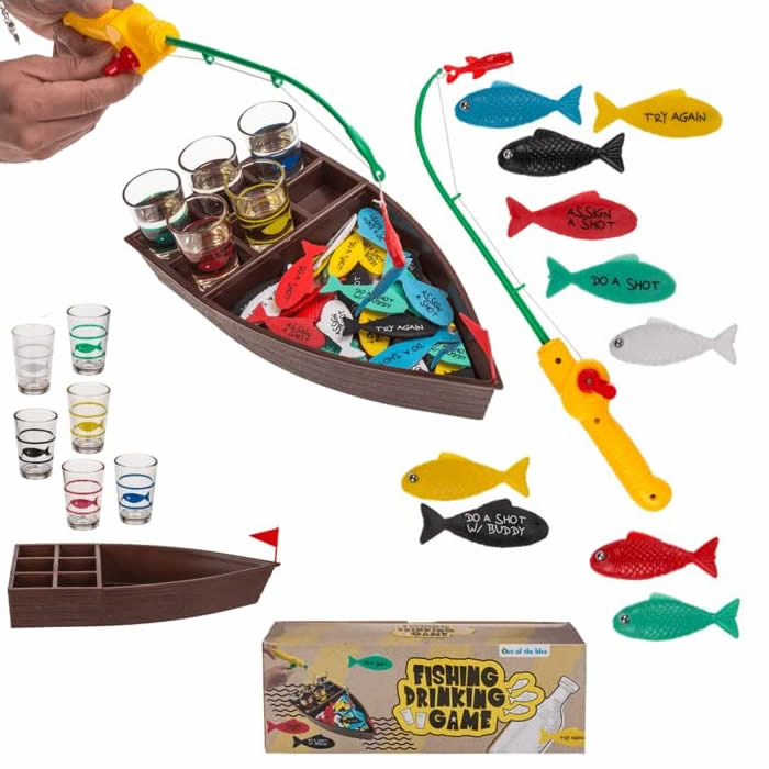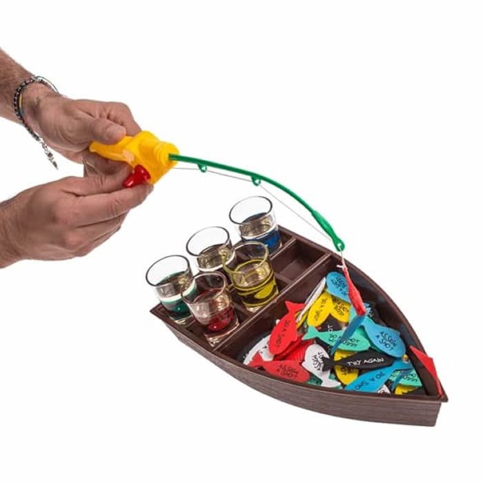 A great party drinking game that involves catching fish from the boat. Each fish has its own inscription that informs the participant on the task at hand; down a shot or keep trying.