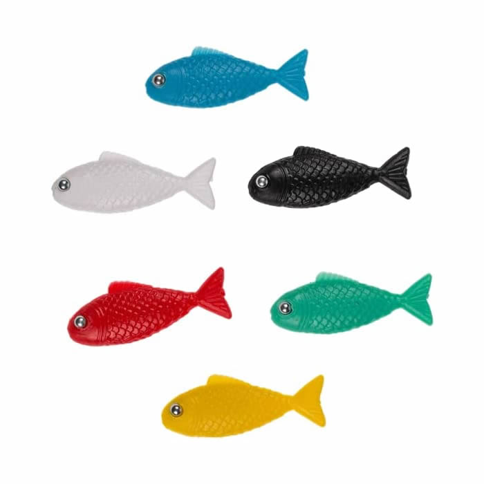 The set includes: 1x fishing rod, 1x boat, 6x glasses, 24x fish with inscriptions.