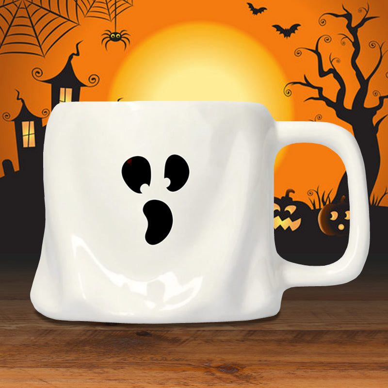 This fun ghost mug is perfect for use during the halloween period. Ideal for use at home and in the office. Each ceramic mug measure H10cm x 10cm diameter, with a misshaped bottom to resemble a ghosts figure and a painted ghost face on the front. Handwash only. Not suitable for microwave or dishwasher.
