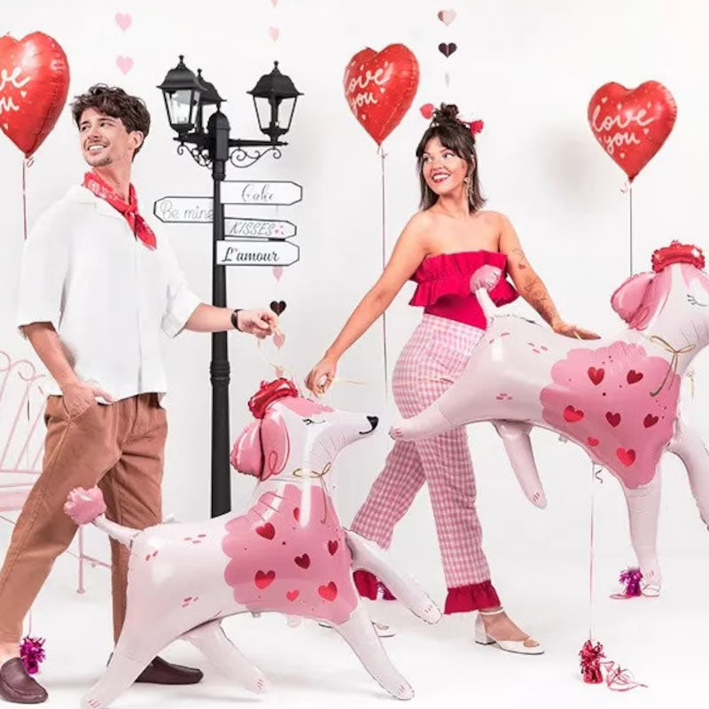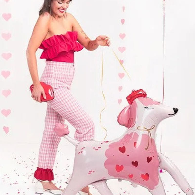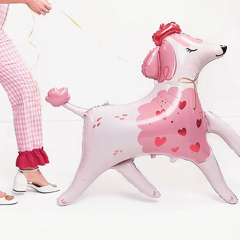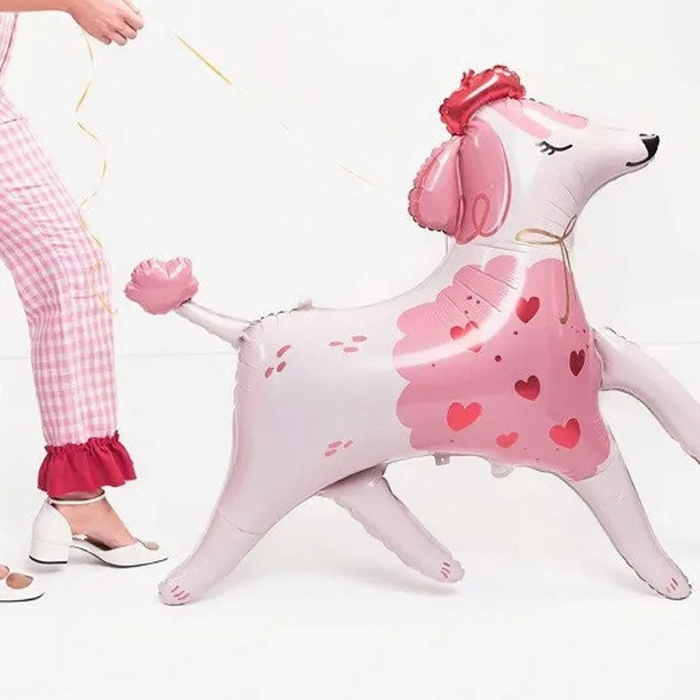 Make your celebration pop with this charming giant poodle balloon! The pink and white design is adorned with lovely heart patterns and detailed features like a red bow, expressive face, and a fluffy tail. Perfect for birthdays, pet-themed gatherings, or any festivities, it's sure to capture attention and bring joy to any party space. This balloon can be filled with air or helium and comes with a straw for easy inflation. Guaranteed to maintain its shape with high-quality foil material.