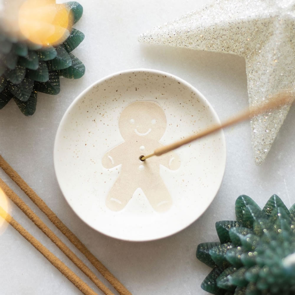 This adorable incense plate will catch any falling ash when holding your favourite, festive incense stick. A smiling gingerbread man and speckled, off-white finish makes this a cute and understated piece for any home at Christmas time.