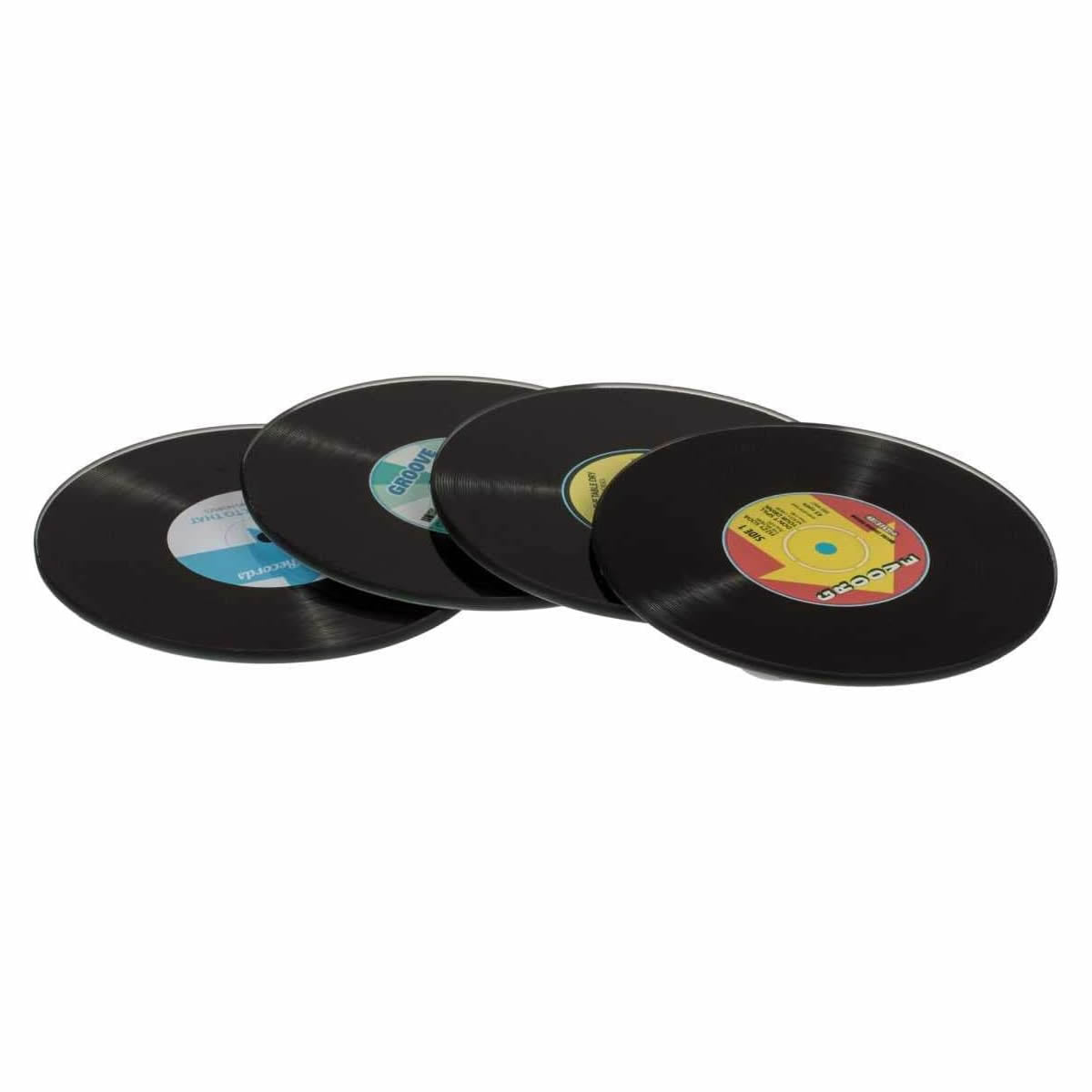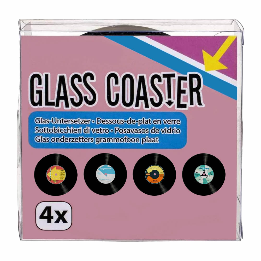 A pack of 4 glass record-shaped drink coasters, perfect for parties and celebrations with a retro 60s and 70s aesthetic. Each coaster is approximately 10 cm in diameter and made of durable glass. 4 individual record label designs.