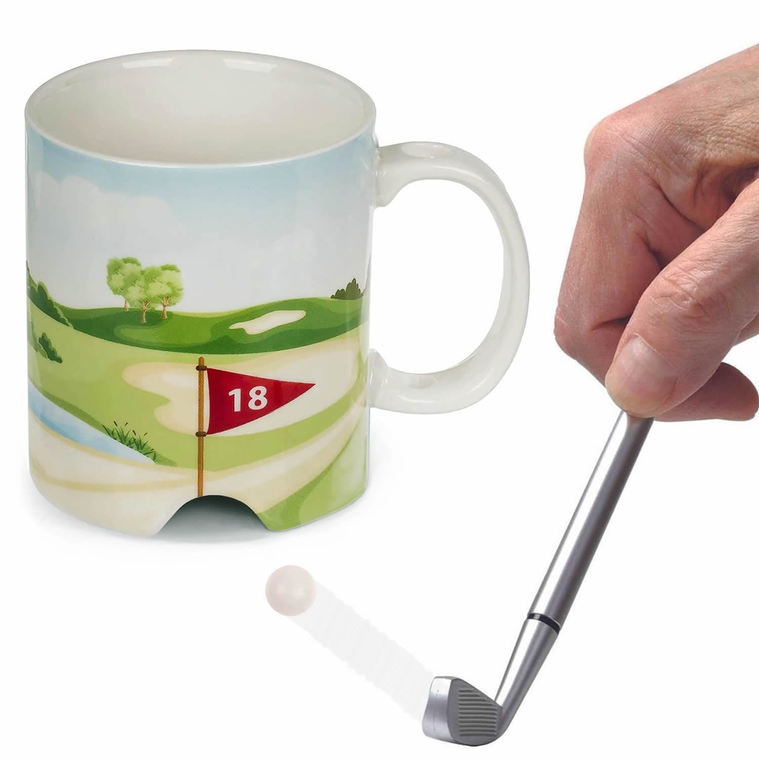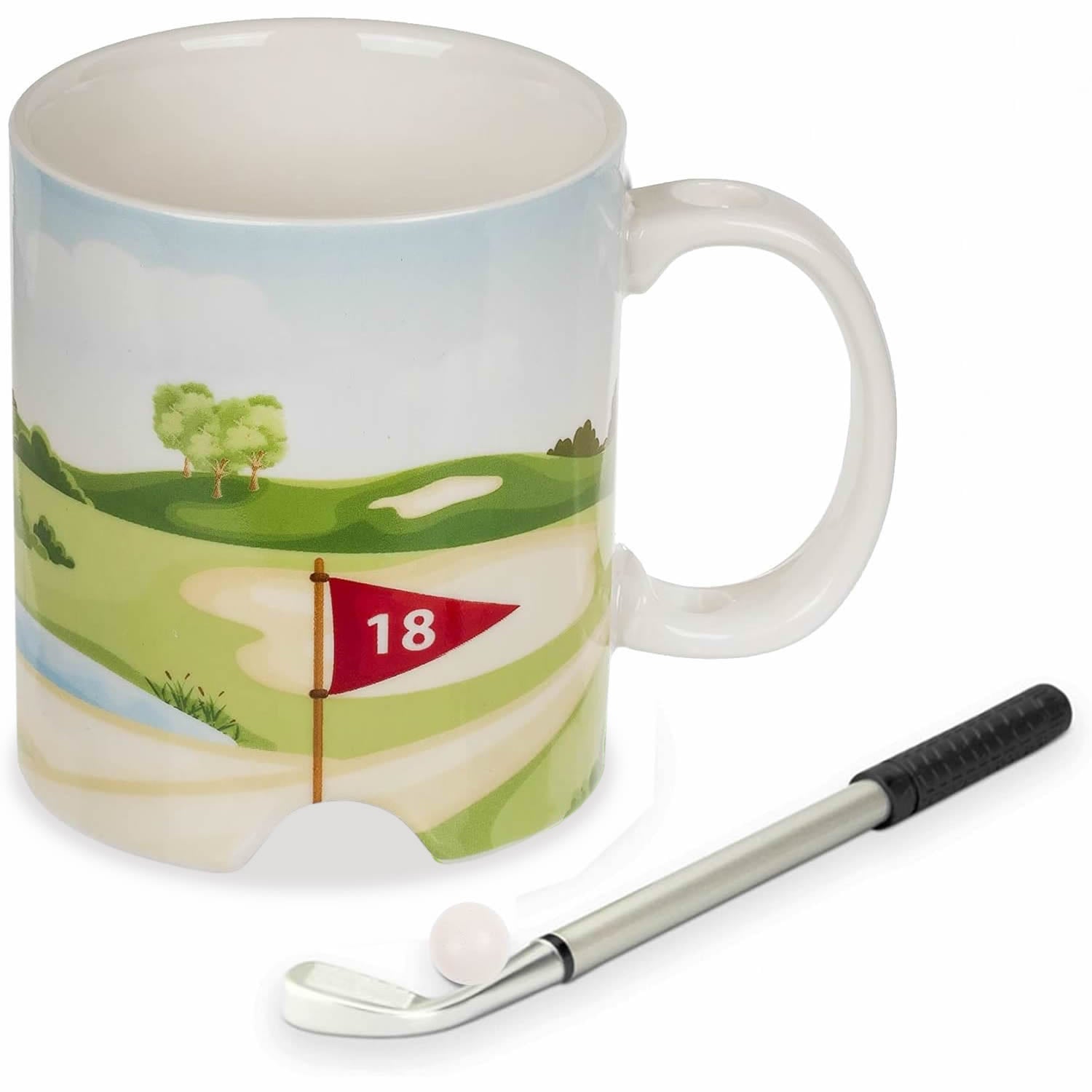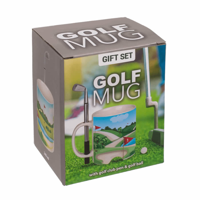 This cool mug is printed with a design of a golf course with first and 18th hole flags and has a hole at the bottom to putt the ball into. Comes with a golf club shaped ballpoint pen and a mini golf ball. Play mini golf as you drink your hot coffee, tea or chocolate! Ideal as a pastime in the office or as fun for in between. An ideal present for golf enthusiasts.