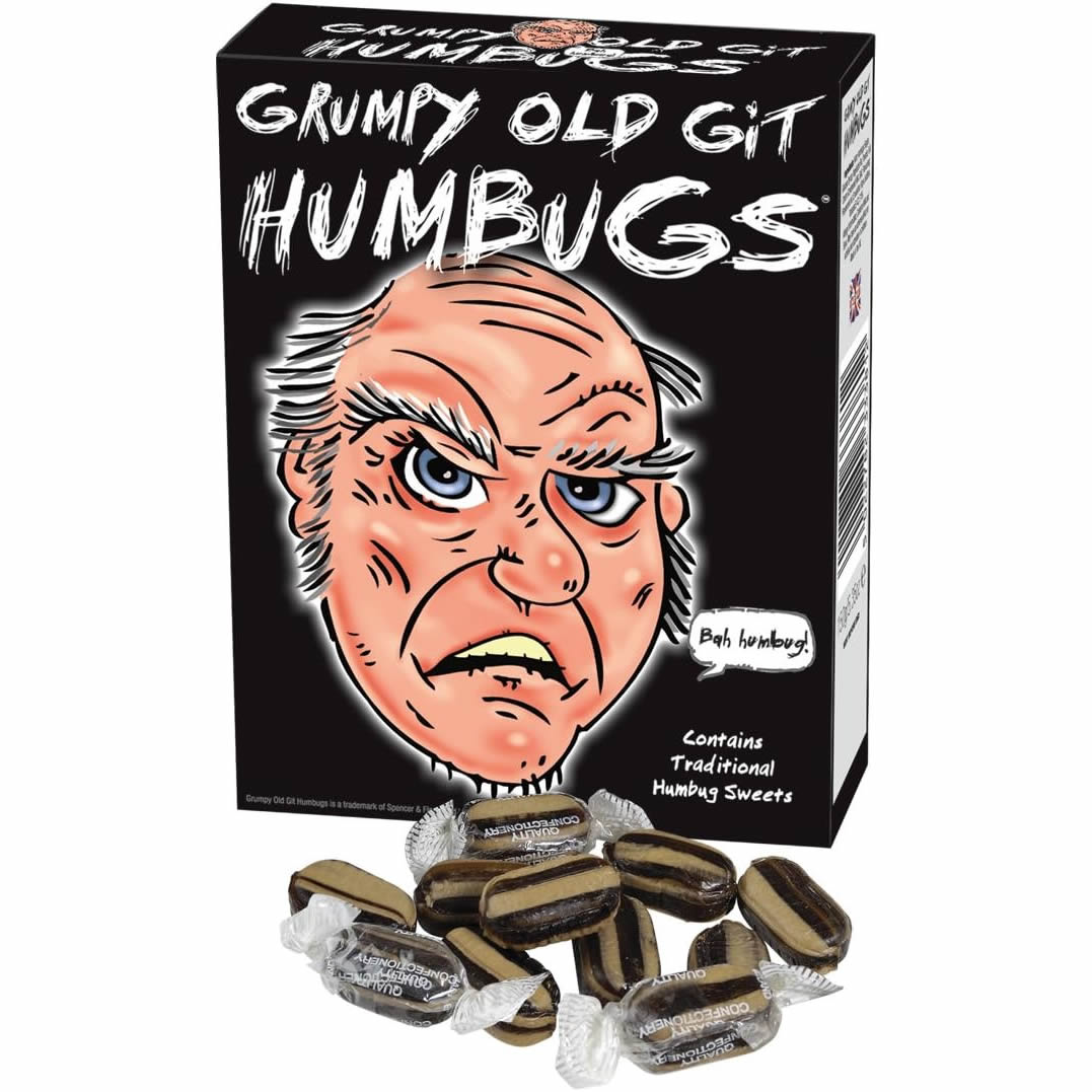 Grumpy Old Git Humbugs. Traditional Humbug sweets manufactured in UK. Fun novelty gift for any mint humbug lover. A perfect gift for the grumpy old git in your life! Box contains 120g (12 x mints). Comes in comical black gifting box reading Grumpy Old Git Humbugs.