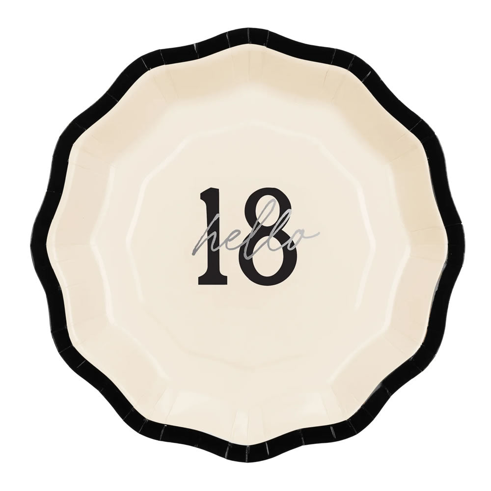 Celebrate a 18th birthday with these stylish cream paper plates featuring bold black accents and a silver "Hello" design. Measuring 18 cm, they’re perfect for serving treats while adding a sleek, festive touch to your party. Durable and elegant, they bring a daring flair to any celebration.