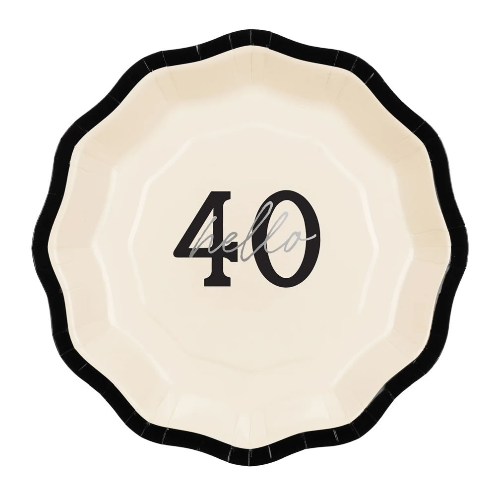 Celebrate a 40th birthday with these stylish cream paper plates featuring bold black accents and a silver "Hello" design. Measuring 18 cm, they’re perfect for serving treats while adding a sleek, festive touch to your party. Durable and elegant, they bring a daring flair to any celebration.