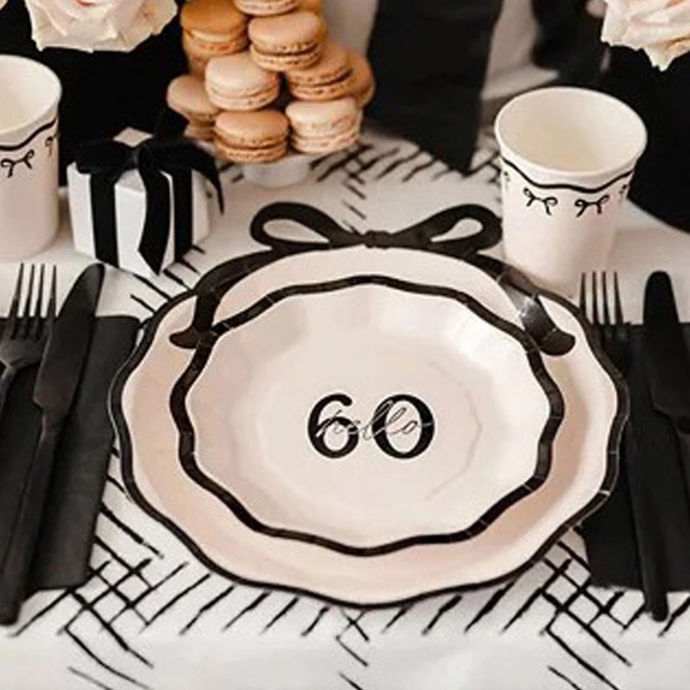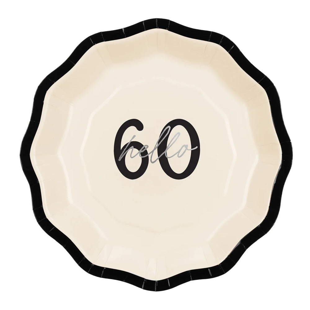 Celebrate a 60th birthday with these stylish cream paper plates featuring bold black accents and a silver "Hello" design. Measuring 18 cm, they’re perfect for serving treats while adding a sleek, festive touch to your party. Durable and elegant, they bring a daring flair to any celebration.