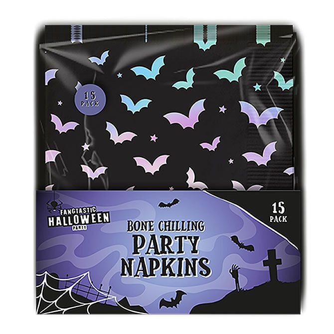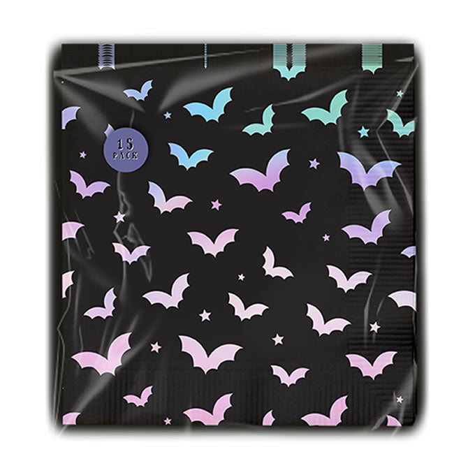 These fun and spooky holographic paper napkins will make a great addition to seasonal events. Each pack comes with 20 single use napkins printed with a holographic purple and black bat design. This product comes in a display box.