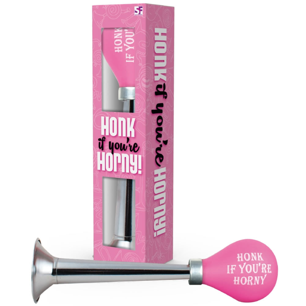 Let everyone know when you're horny with this super cool novelty metal horn with a pink rubber honker. Squeeze the end and make yourself known, it will leave them in no doubt whatsoever. Why be subtle when you can be loud and raucous. Fab for Parties, Boys and Girls Nights Out and much more.