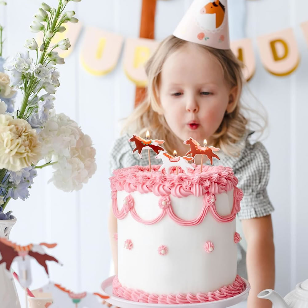 Add bold charm to your party with these horse-themed birthday candles. Featuring three detailed horses in brown and white, each on a wooden stick for easy cake placement. Perfect for horse lovers and rustic celebrations, they come in a stylish pink-striped box—ready to make your birthday unforgettable.