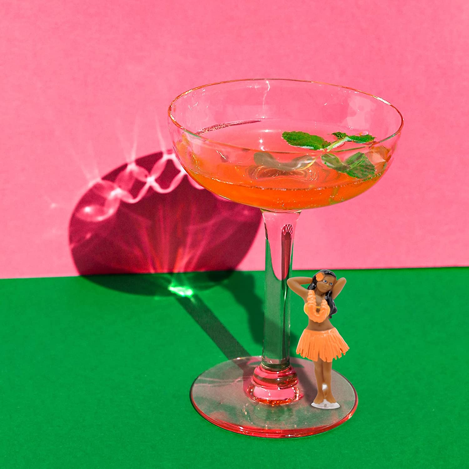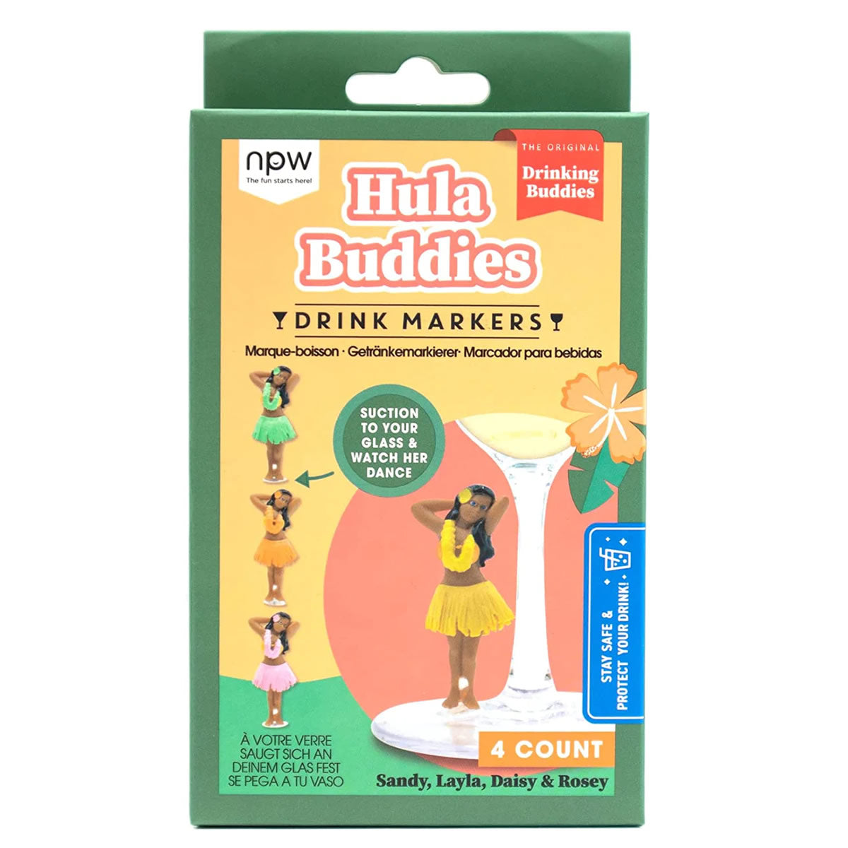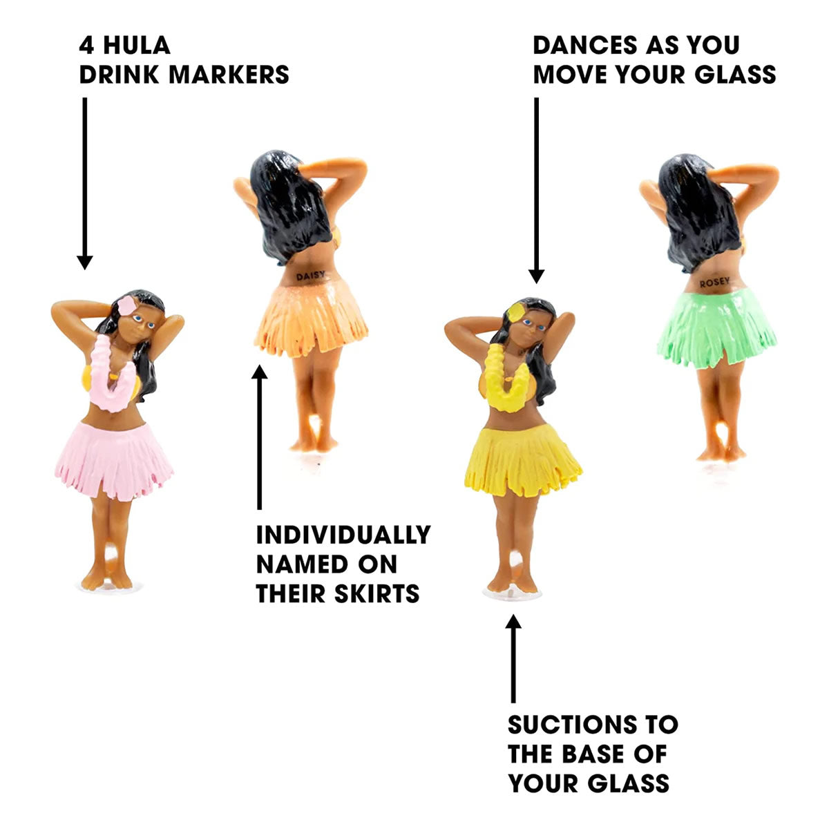 Pack of 4 Hula Buddies Drink Markers that suction to the stem of your glass.