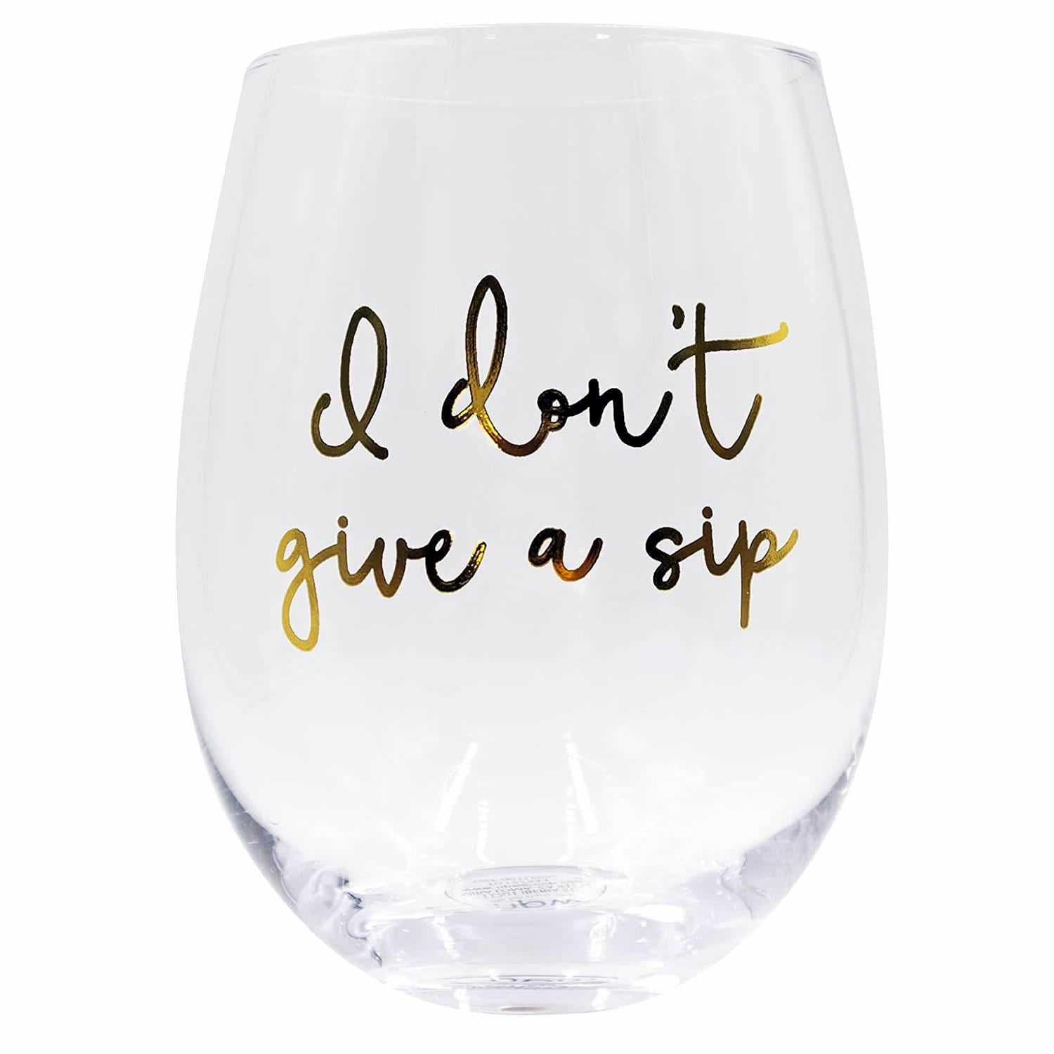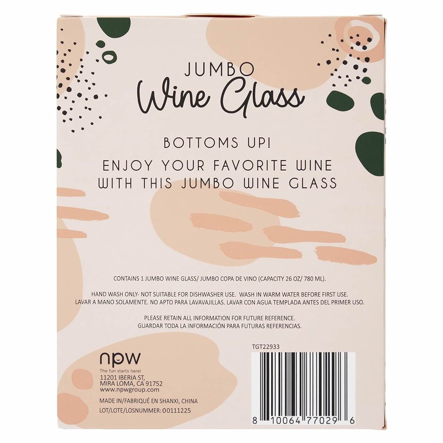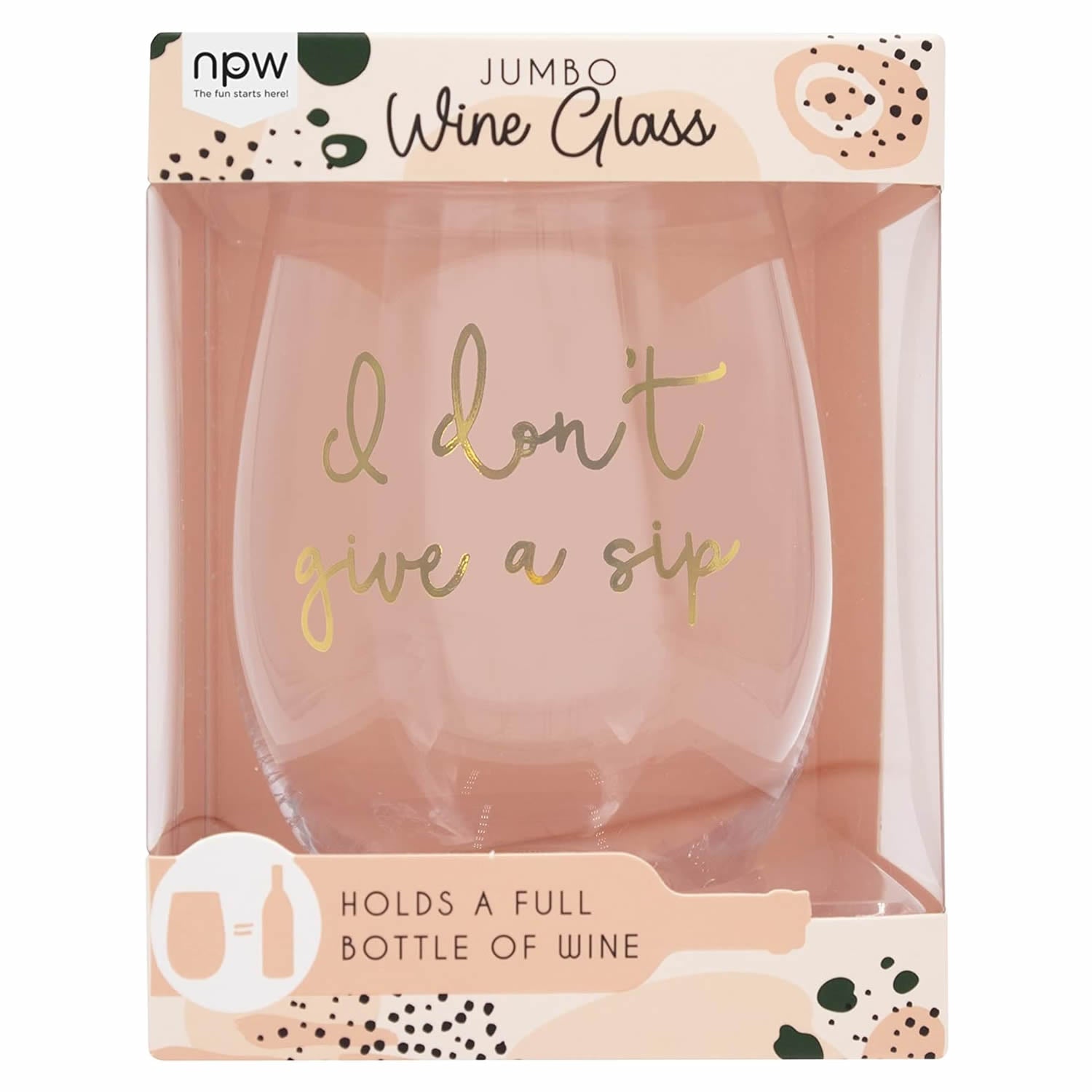 A Jumbo Wine Glass that holds a full bottle of wine, perfect for busy mums that don't have time to keep filling up! Finished off with a metallic gold inscription reading: 'I don't give a sip'. Bottoms up! Enjoy your favourite wine with this perfectly sized wine glass. Capacity 780ml.