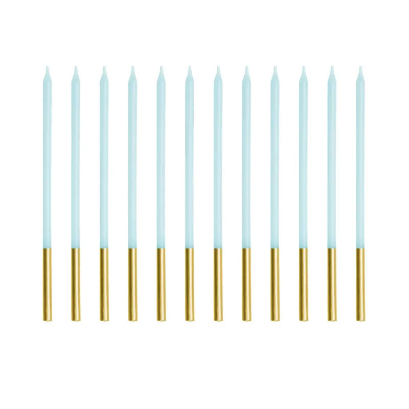 Pack of 12 elegant light blue candles with metallic gold bases. Standing 14cm tall, these bold statement pieces transform any cake into a showstopper. Their versatile design works for both kids' birthdays and sophisticated adult celebrations. Slim yet sturdy for perfect placement and even burning.