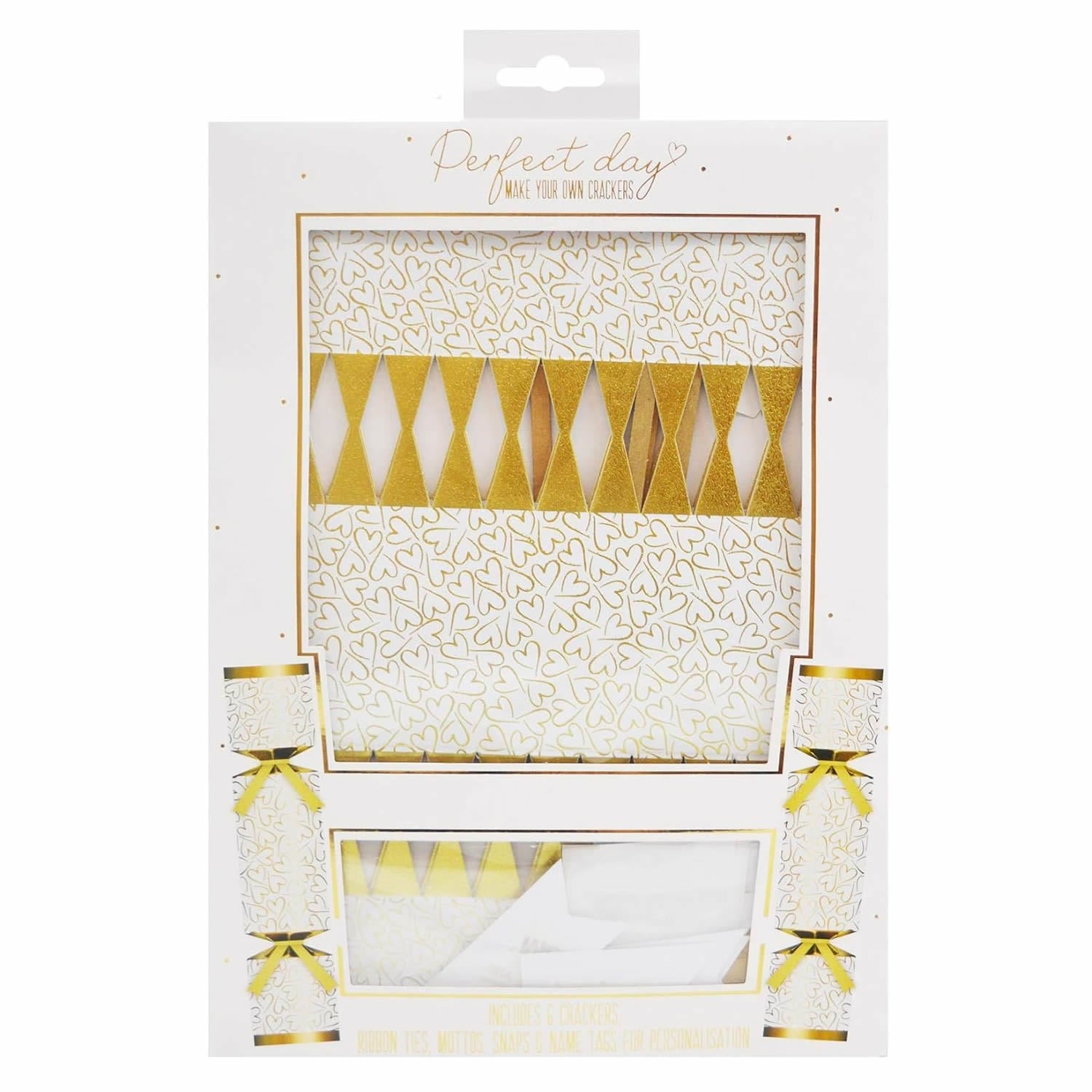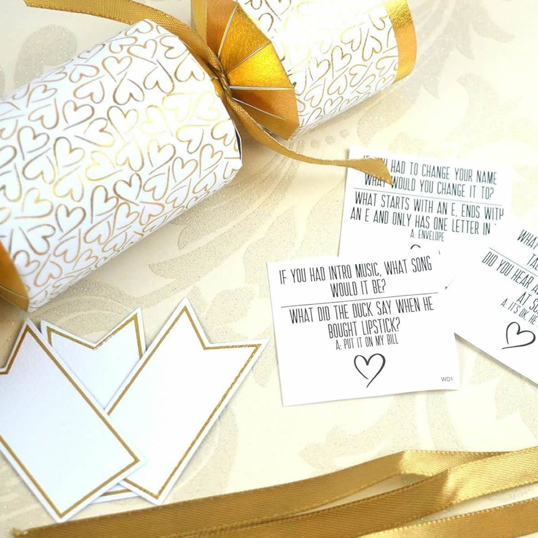 Set includes 6 Crackers with snaps attached, 6 Ribbon Ties , 6 Name Tags for Personalisation and 6 Joke Cards.
