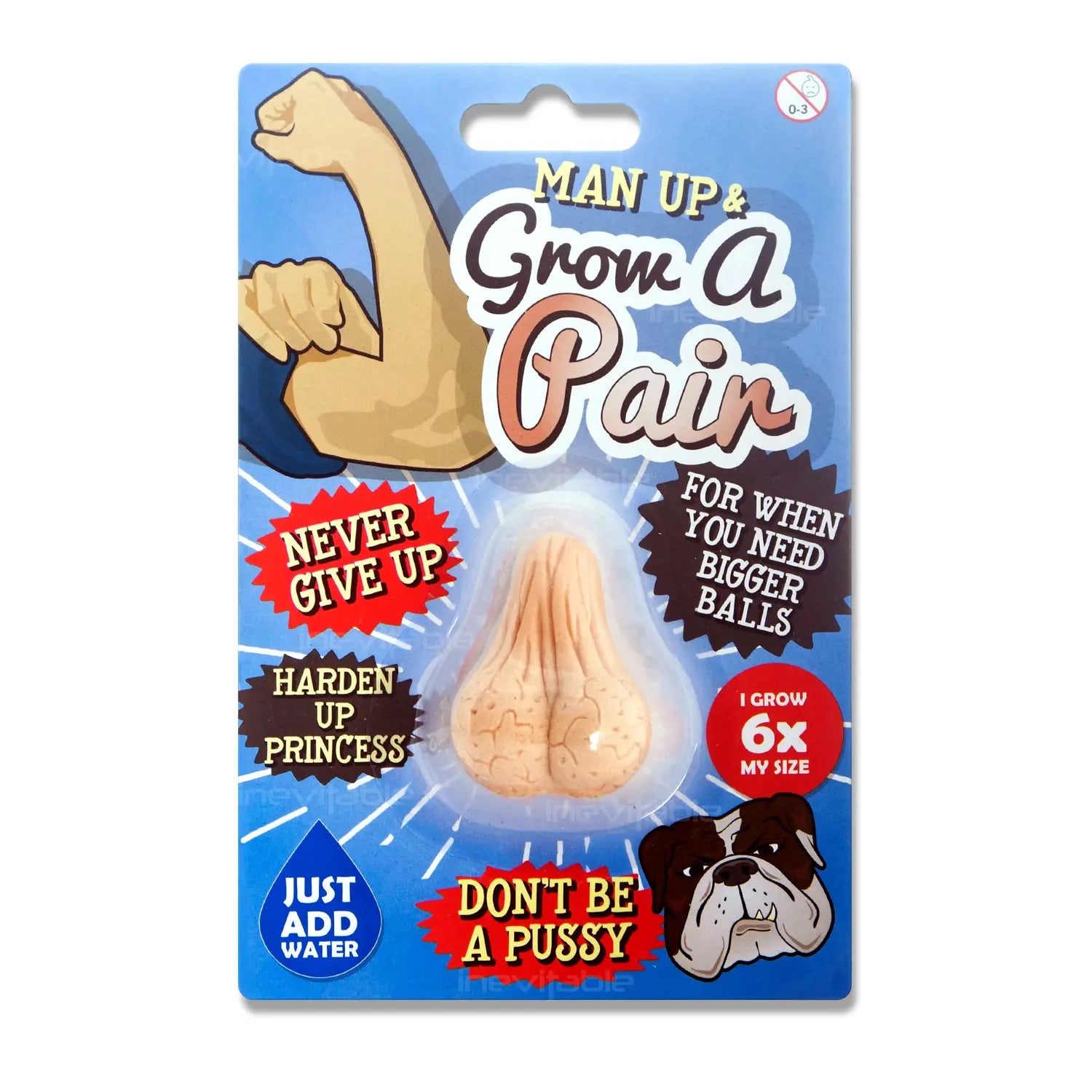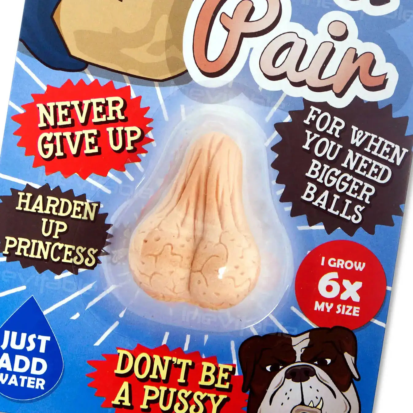 Hilarious, rude gag gift for a man that simply needs to grow a pair of balls and man up! Grows up to six times original size! - simply drop into some water and finally grow some balls! Remove from the water once fully grown and watch the balls shrink back to its original size ready to be grown over and over again! The fun never ends!