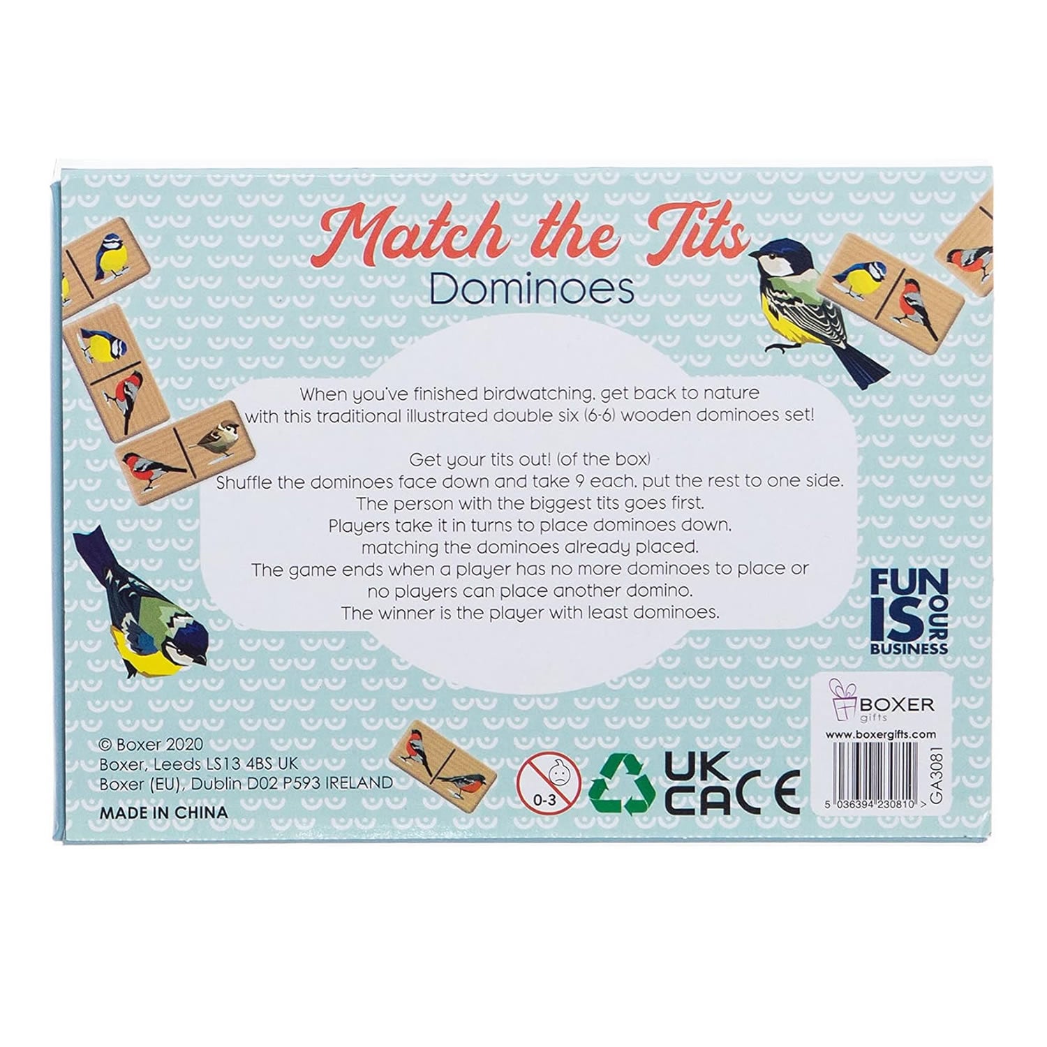 Think you know a pair of great tits when you see them? Prove it with this funny twist on the classic double six dominoes set! These wooden dominoes feature high-quality decals of tits, perfect for any nature-loving friends or family! Encased within a premium decorated box, this game would make the perfect addition to any stag do or games night – birdwatching credentials not required!