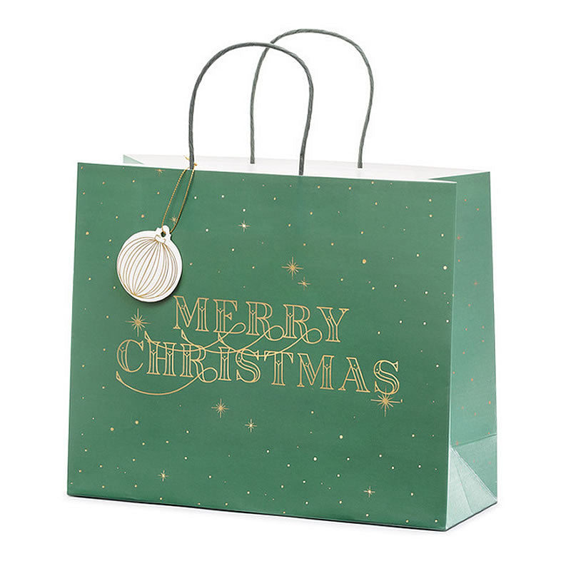 This gift bag features a 'Merry Christmas' message printed in a gold metallic print, adorned with sparkling stars for a joyful festive look. Measuring 32.5 cm wide, 26.5 cm tall, and 11.5 cm deep, this bag offers ample space to accommodate gifts of various sizes. Whether presenting gifts to loved ones or using it as a decorative accent, this charming bag captures the spirit of the holiday season.