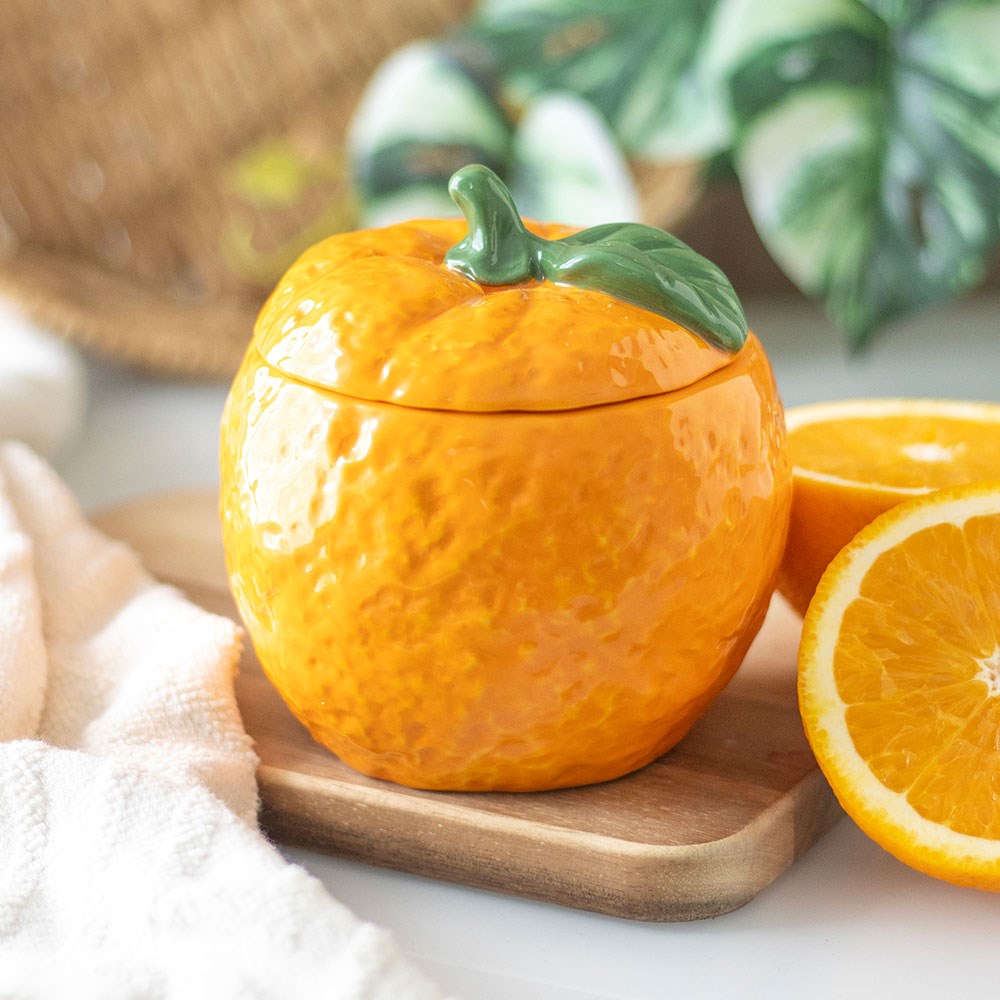 Add some zest to your space with this fun candle jar, shaped like a freshly picked orange. Both functional and adorable, this scented candle doubles as a delightful décor item for kitchens, living rooms and more. Approximate burn time of 16 hours.