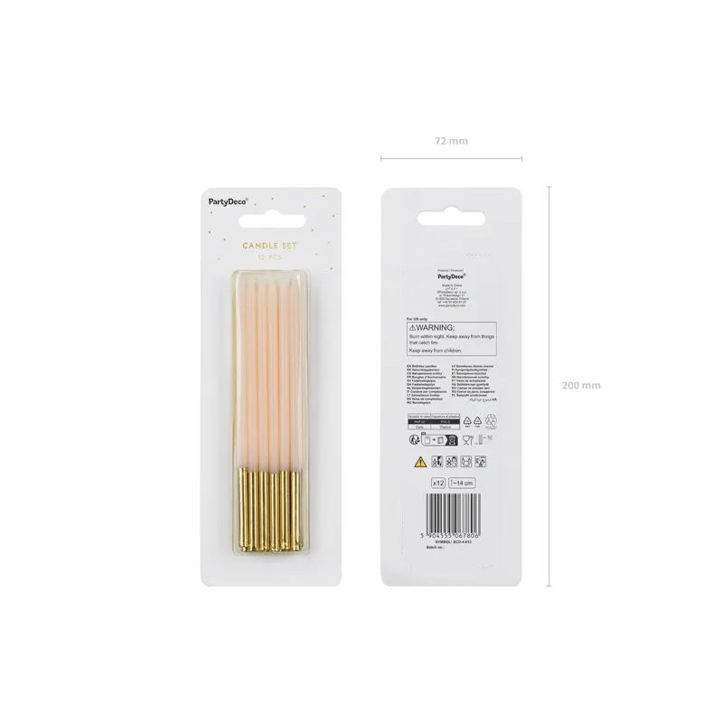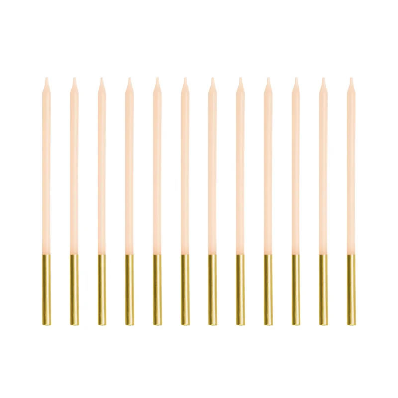 Set of 12 tall peach candles with gold food safe bases. These 14cm statement pieces burn steadily while adding bold elegance to any celebration. Their striking height and warm peach colour transform ordinary cakes into unforgettable centrepieces for both kids' parties and sophisticated adult gatherings.