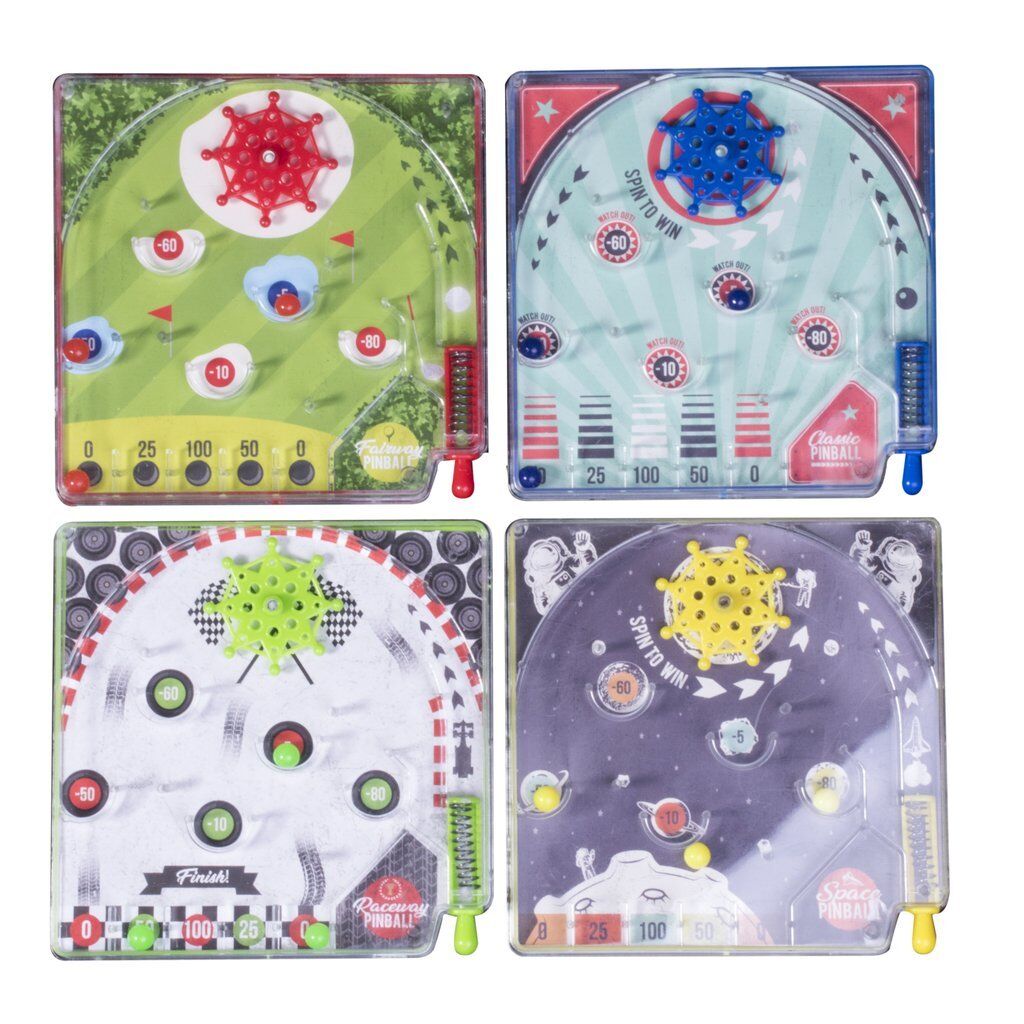 Set of 4 playable mini pinball coasters. Have fun while keeping your tabletop clean and dry. Features 4 different designs such as golf course and outer space.