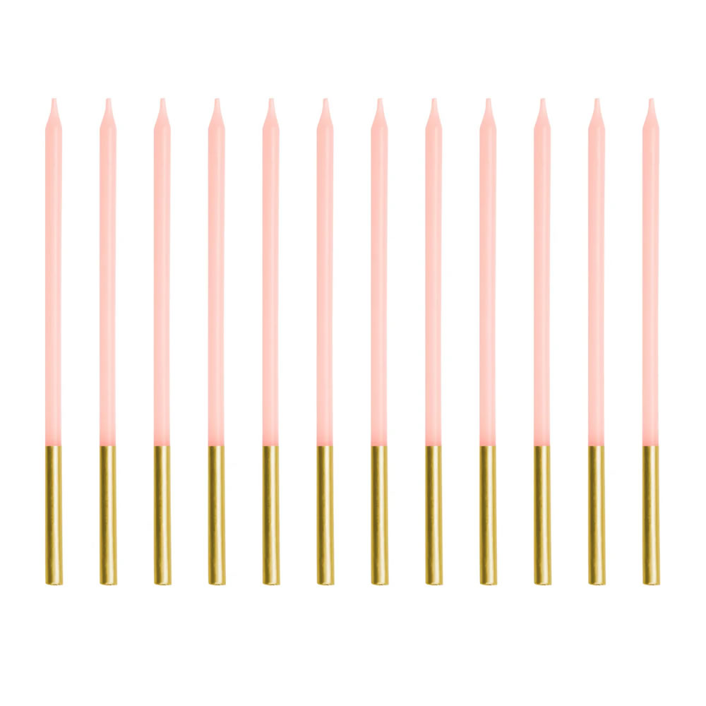 Audaciously tall peach candles with gold bases that demand attention on any cake. These 14cm statement pieces burn with attitude, transforming ordinary celebrations into unforgettable spectacles. Set of 12 bold candles that refuse to be ignored.
