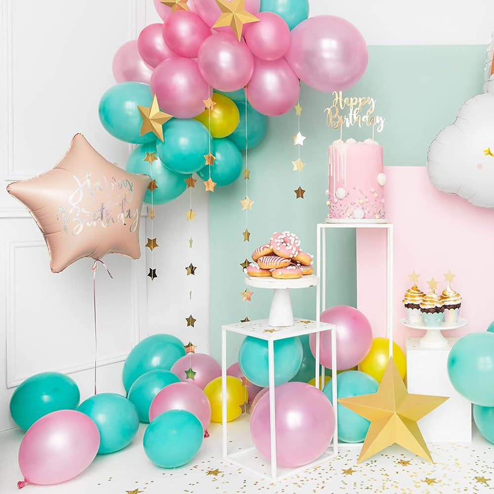 Light powder pink star-shaped foil balloon with silver "Happy Birthday" lettering. Suitable for inflating with helium to float or air for hanging display. Makes a bold statement at any celebration.
