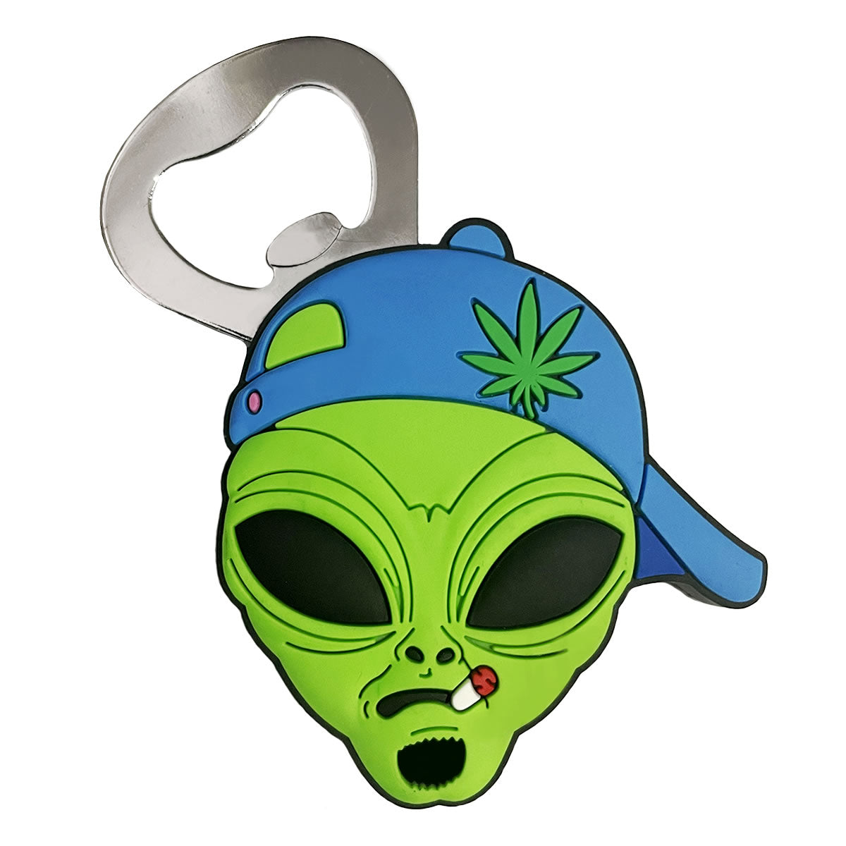 Pop the Top with this slim, lightweight funky alien head bottle opener. The bottle opener also doubles up as a fridge magnet, so you can stick it on the fridge door ready to pop the top off your next beer. Made from durable rubberised material with a unique design of the alien smoking a reefer, wearing a blue baseball cap with cannabis emblem, and a small goatee beard. The ideal gift for sci-fi or alien lovers. The perfect conversation starter at any gathering. Dimensions: height 90mm, width 60mm.