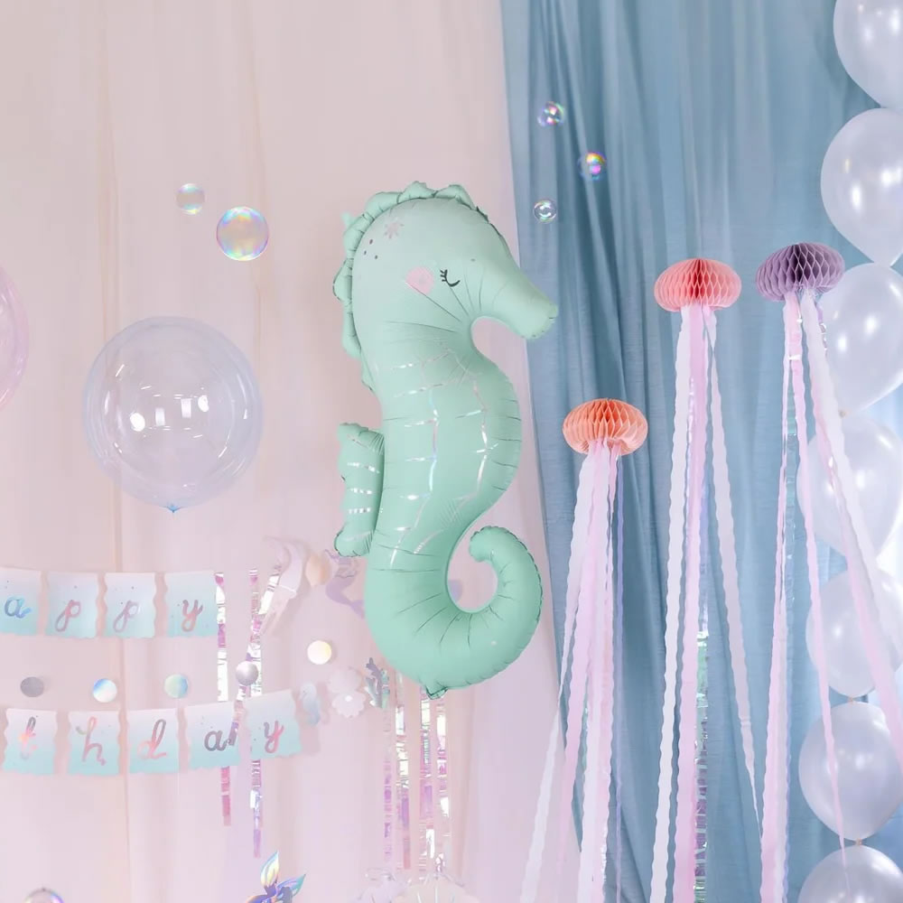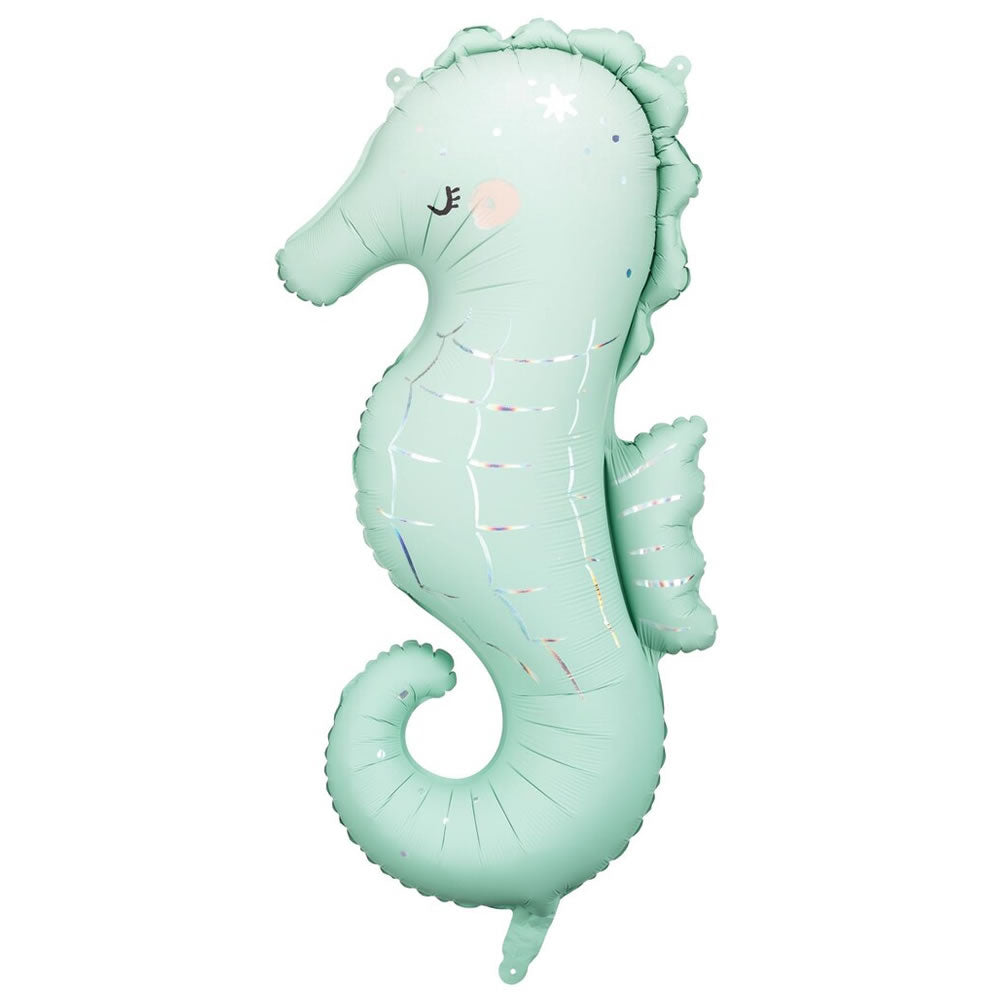 Mint green seahorse foil balloon with holographic shimmer. Stands 98cm tall and features cute eyelashes and pink cheeks. Perfect for underwater themes and parties. Made of durable foil that holds shape. Inflate with helium or air. Hanging tabs included for easy display.