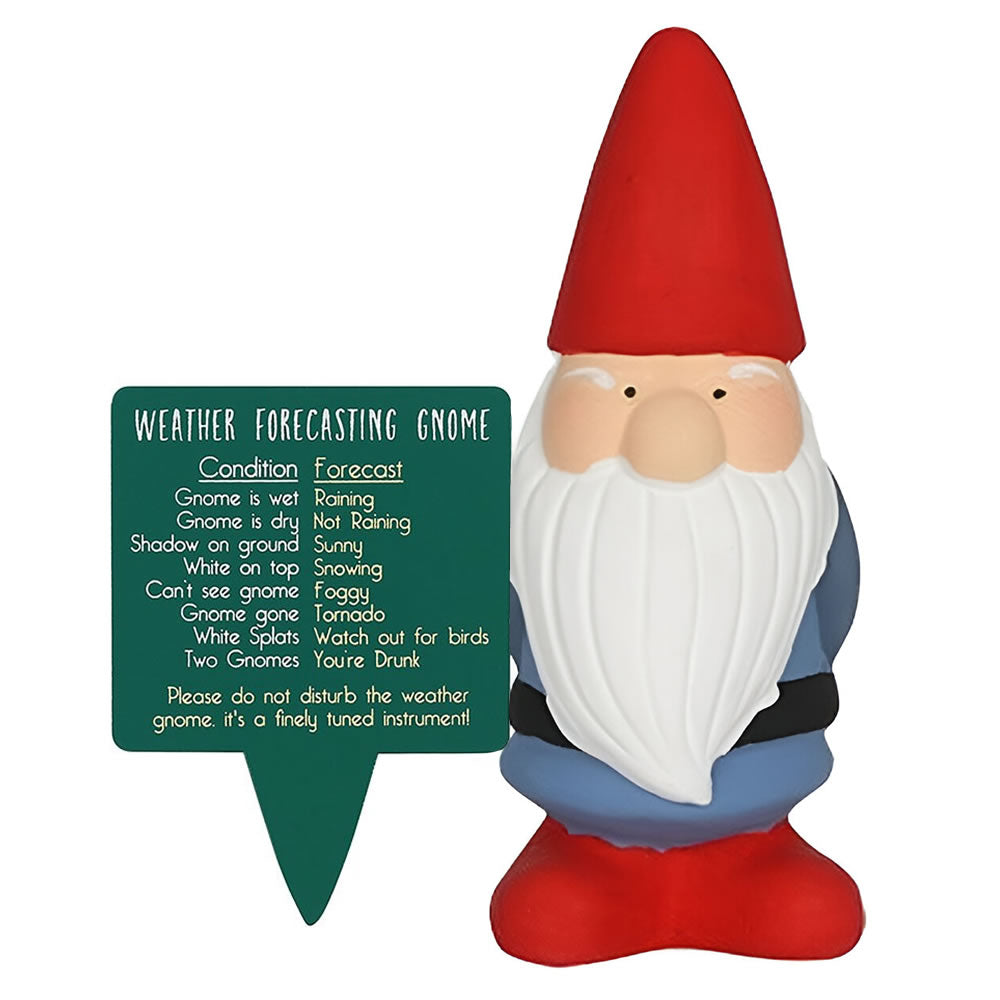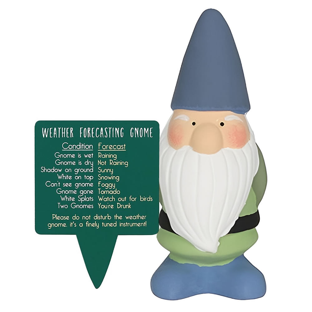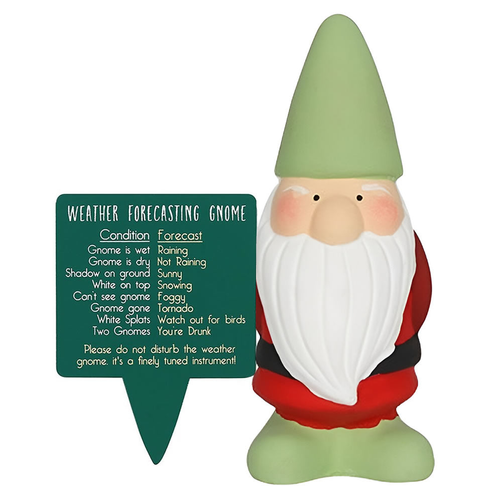 This endearing 'weather forecasting' gnome is just the man to depend on. Place him in the garden along with his tiny wooden sign and be the first to know when there's rain, sun, or snow.