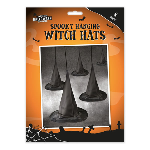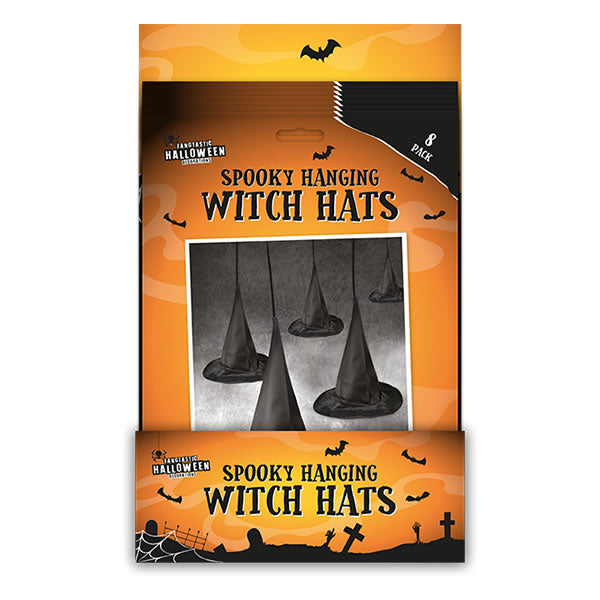 These Spooky Hanging Witch Hats are perfect for adding a festive touch to Halloween festivities. The pack includes eight individual hats made from durable nylon, each measuring L24cm x 20cm with a L49cm string. Packaged in a colourful display box.