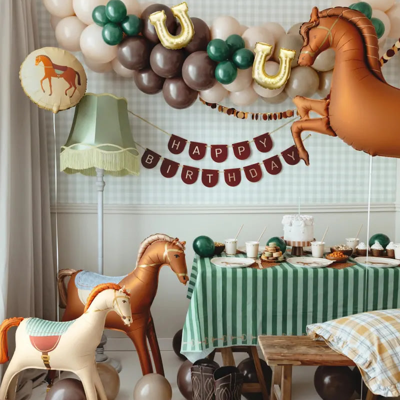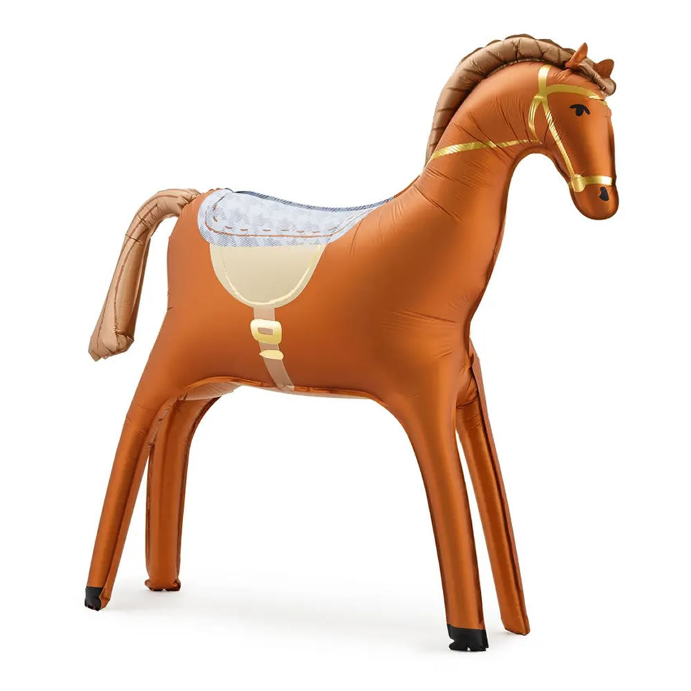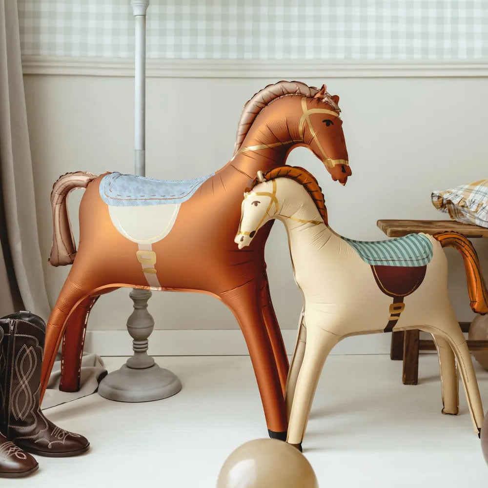 Add a bold touch to your celebration with this cream-coloured standing horse foil balloon. Featuring a striking baby blue saddle and copper mane, it stands out at 68.5 x 68.5 cm when inflated. Made from premium foil, it creates a captivating 3D effect that commands attention. Perfect for equestrian parties or any event needing a daring centrepiece, this versatile balloon complements any décor and is easy to inflate with the included straw. Make your party unforgettable with this stunning, whimsical decoration.