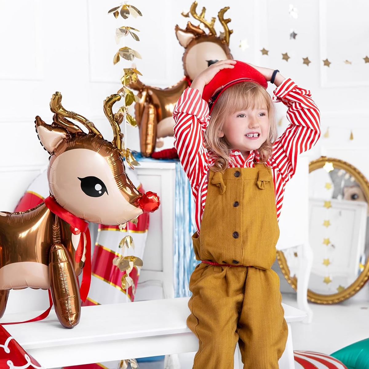 This cute Standing Reindeer foil balloon depicts a jolly Rudolf the rose nosed reindeer figure in a glossy bronze, beige finish, gold antlers and a shiny red nose. Perfect for Christmas parties, or any festive occasion, this balloon can be used as a centrepiece, photo prop, or decorative accent.