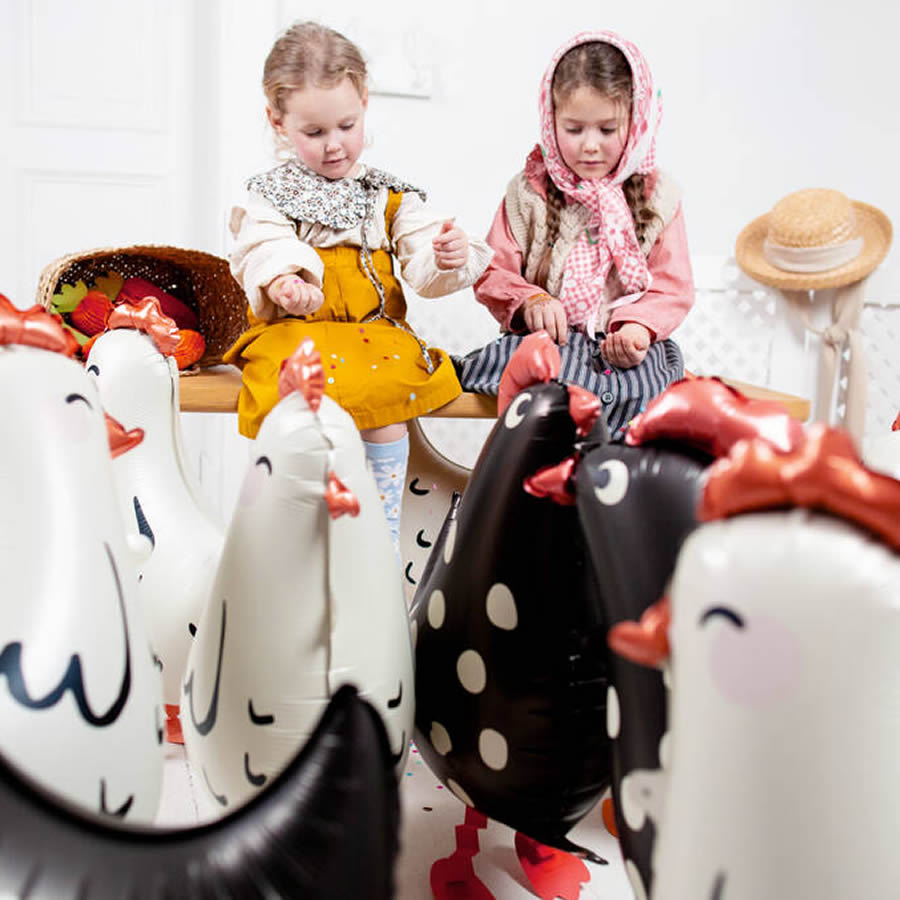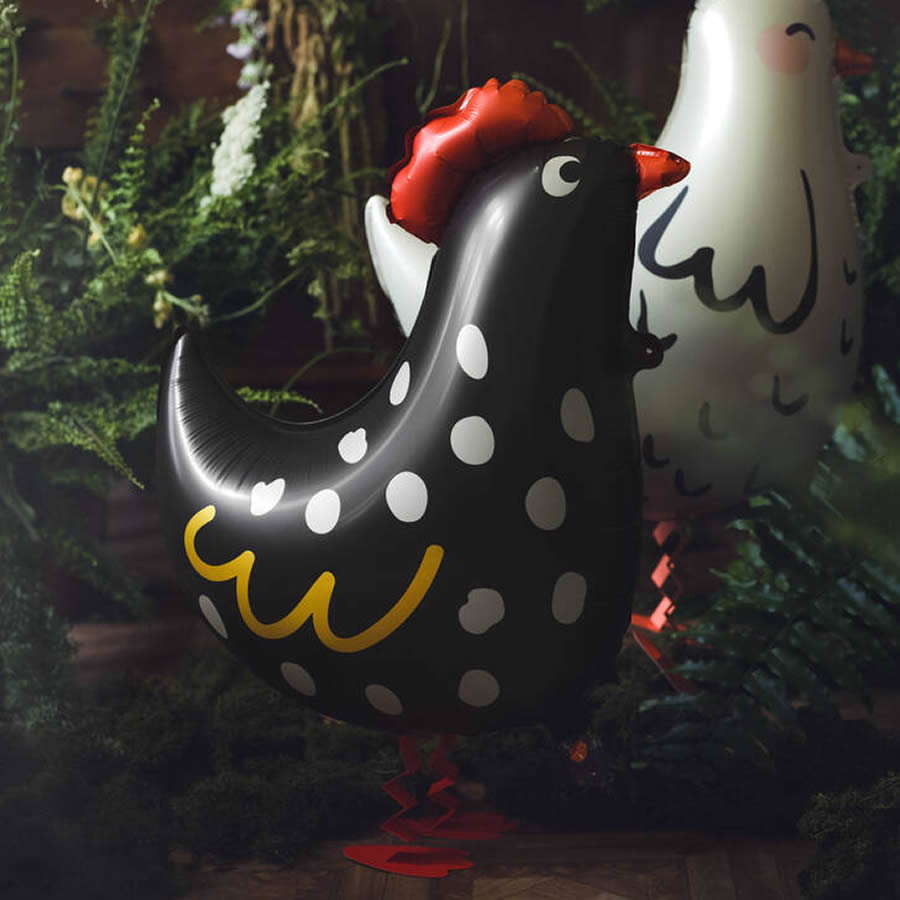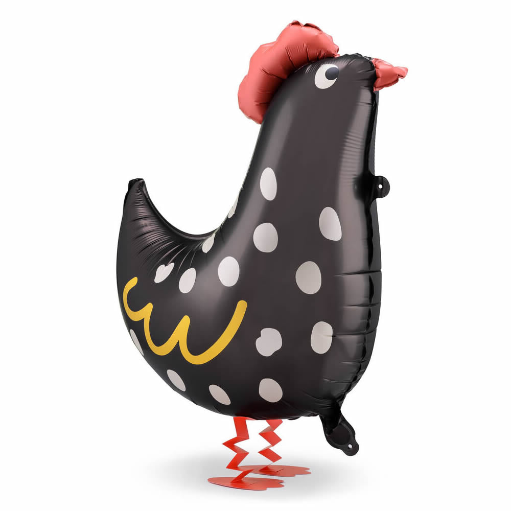 These standing Rooster foil balloons are the perfect addition to your Easter, Spring or Farm Yard themed children's party. The balloon is shaped like a black farmyard rooster, complete with a vibrant red comb and cute little beak, making it a fun and eye-catching decoration. Made from high-quality foil material, this balloon is not only visually appealing but also has a unique walking feature that will captivate and entertain children of all ages. When inflated you can walk them along the floor by attaching ribbon to the tab on the neck.