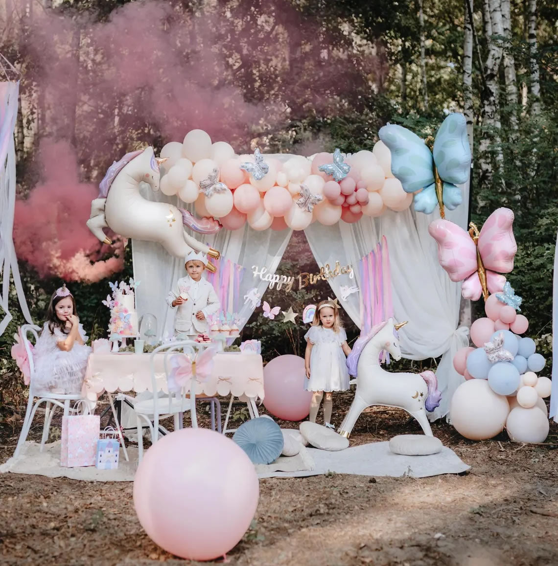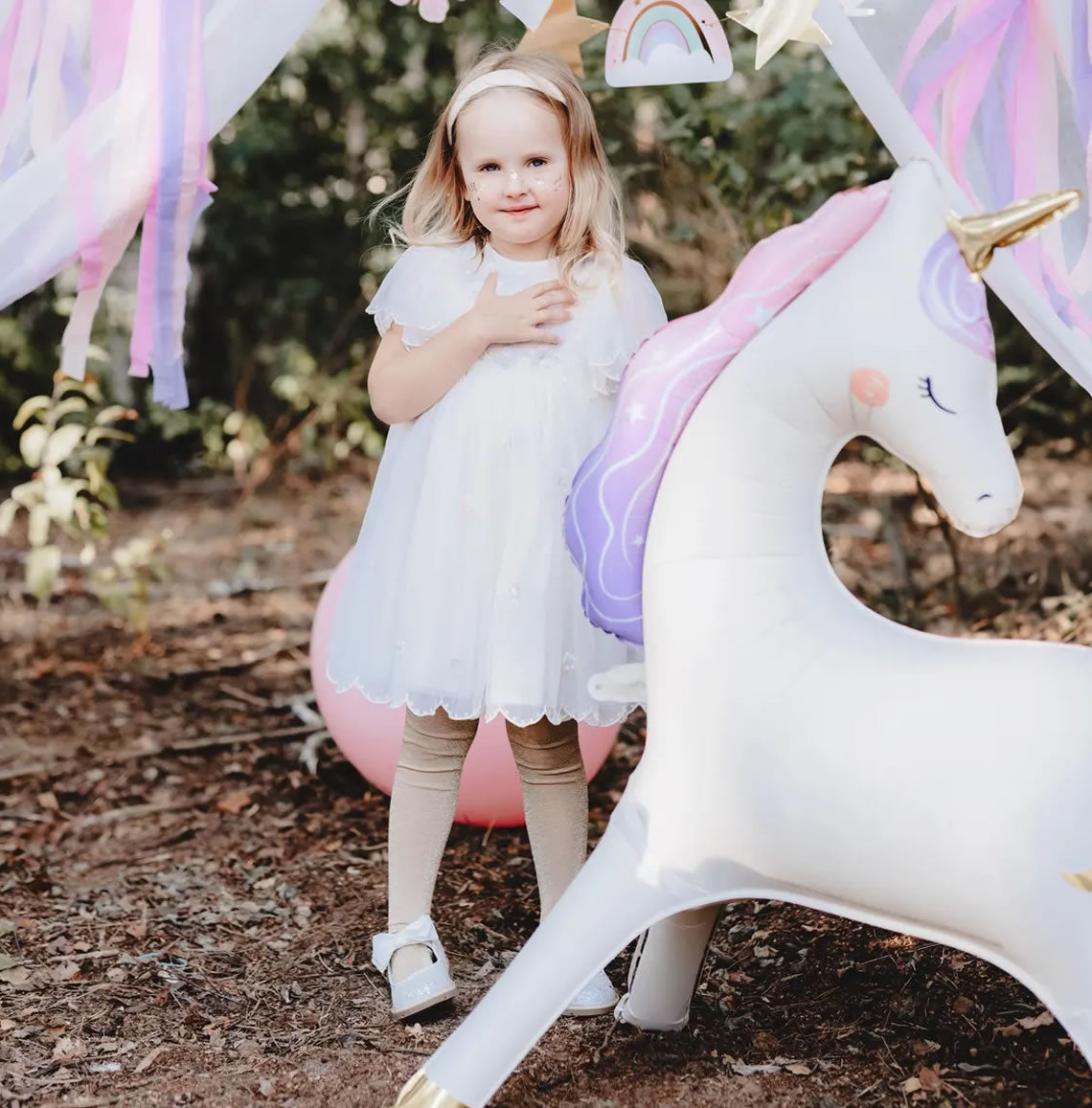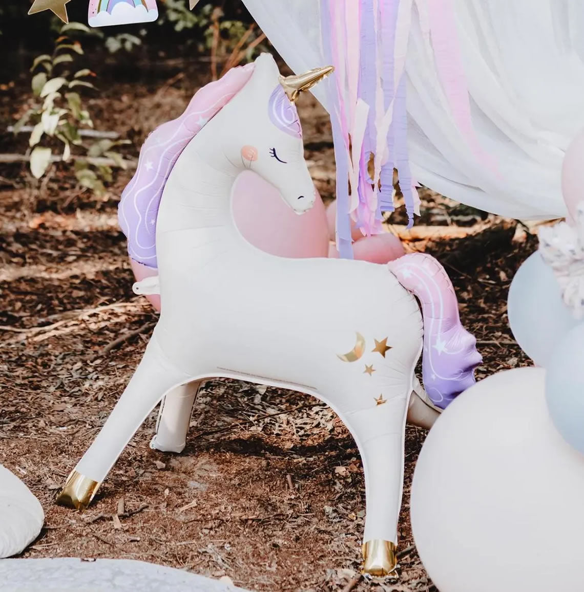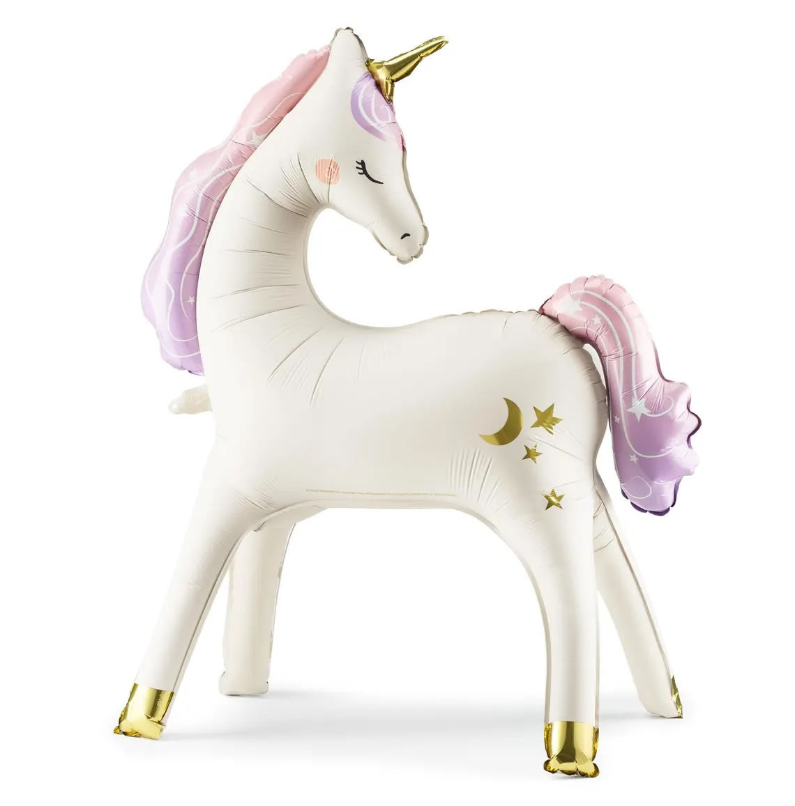 This 1m tall standing unicorn balloon will bring a touch of enchantment to your fantasy themed party. Crafted with a beige matte finish, this balloon features delightful accents of gold and rainbow elements, adding a playful charm. Perfect for birthdays, parties, or simply as a delightful room decoration, this unicorn balloon is sure to captivate and delight.
