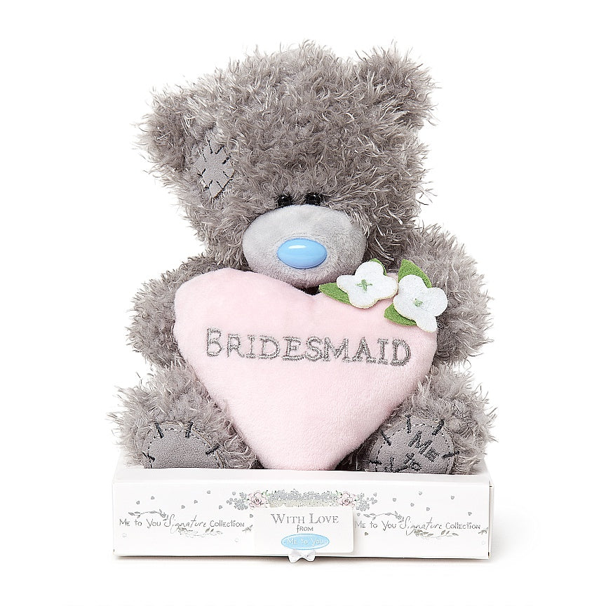 Say a big thank you to your wonderful bridesmaids for making your wedding day So special with this adorable bridesmaid Tatty Teddy bear. The adorable Tatty Teddy is holding a super soft, light pink love heart with 'bridesmaid' Embroidered across the front, and two dainty white flowers. This cute bear makes the perfect keepsake gift for your bridesmaids to remember your big day and comes in a special Me to You signature Collection plinth gift box.